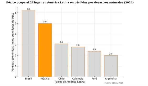 México ocupa el segundo lugar en América Latina en pérdidas económicas por desastres, solo después de Brasil, de acuerdo con datos de la Comisión Económica para América Latina y el Caribe (CEPAL). A nivel nacional, el BancoMundial estima que estos eventos cuestan al país más del 1.5 por ciento de su Producto Interno Bruto (PIB) cada año, considerando daños materiales, costos de reconstrucción e interrupciones productivas.