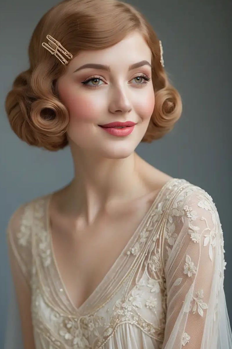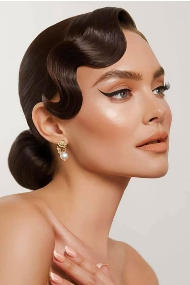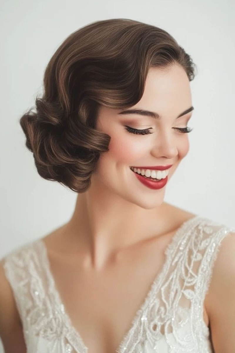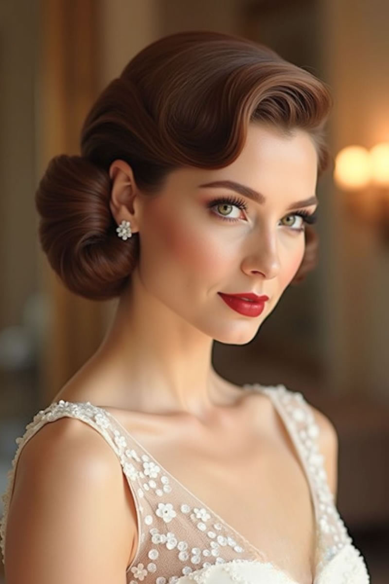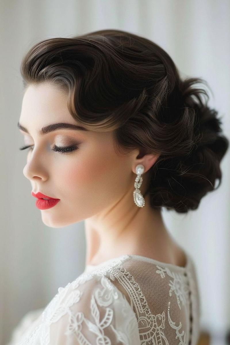 Las ideas de peinados de novia retro incluyen ondas de dedos y ondas en forma de S inspiradas en la década de los veinte, recogidos clásicos como moños y recogidos, y accesorios como velos de jaula o diademas vintage. Otras opciones son rizos voluminosos, mechones recogidos y cortes cortos con ondas de dedos para evocar diferentes épocas vintage. Elige accesorios y un peinado que complementen la época vintage específica que estás retratando y tu estilo de vestir.