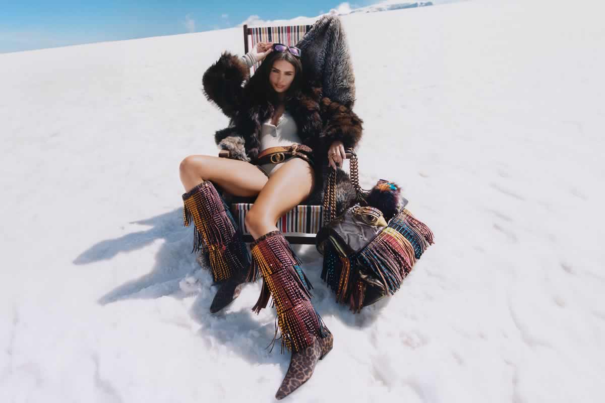 Sol, nieve, accesorios impactantes y Emili Ratajkowski, así es la campaña Otoño – Invierno 2025 de Kurt Geiger