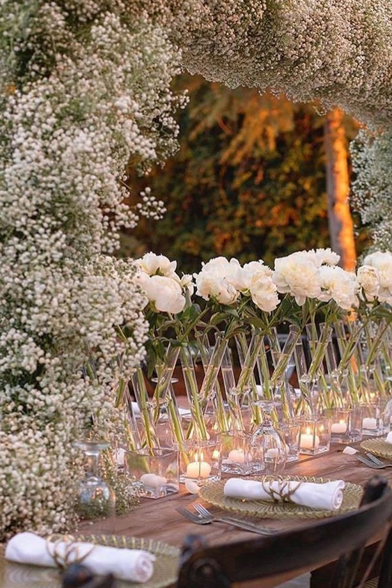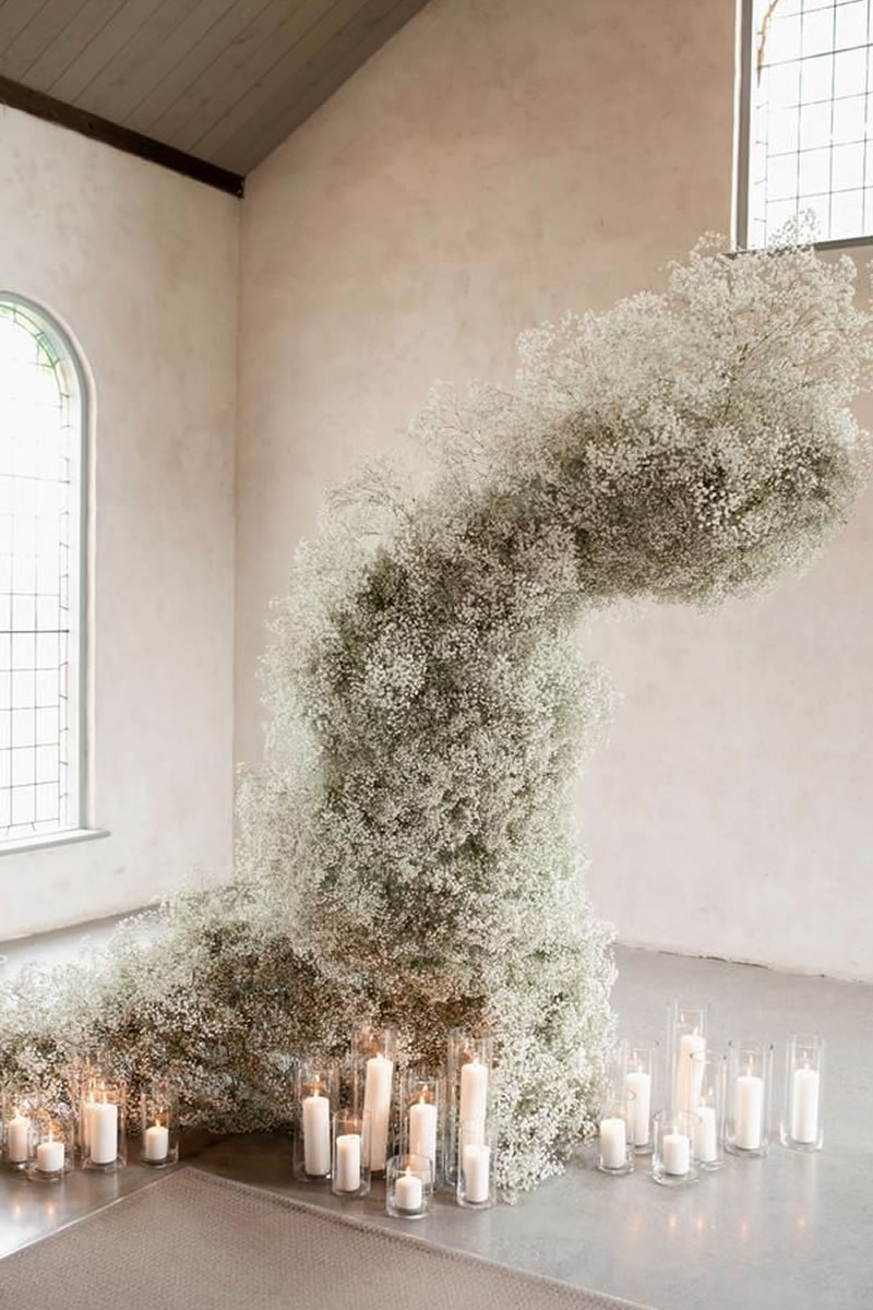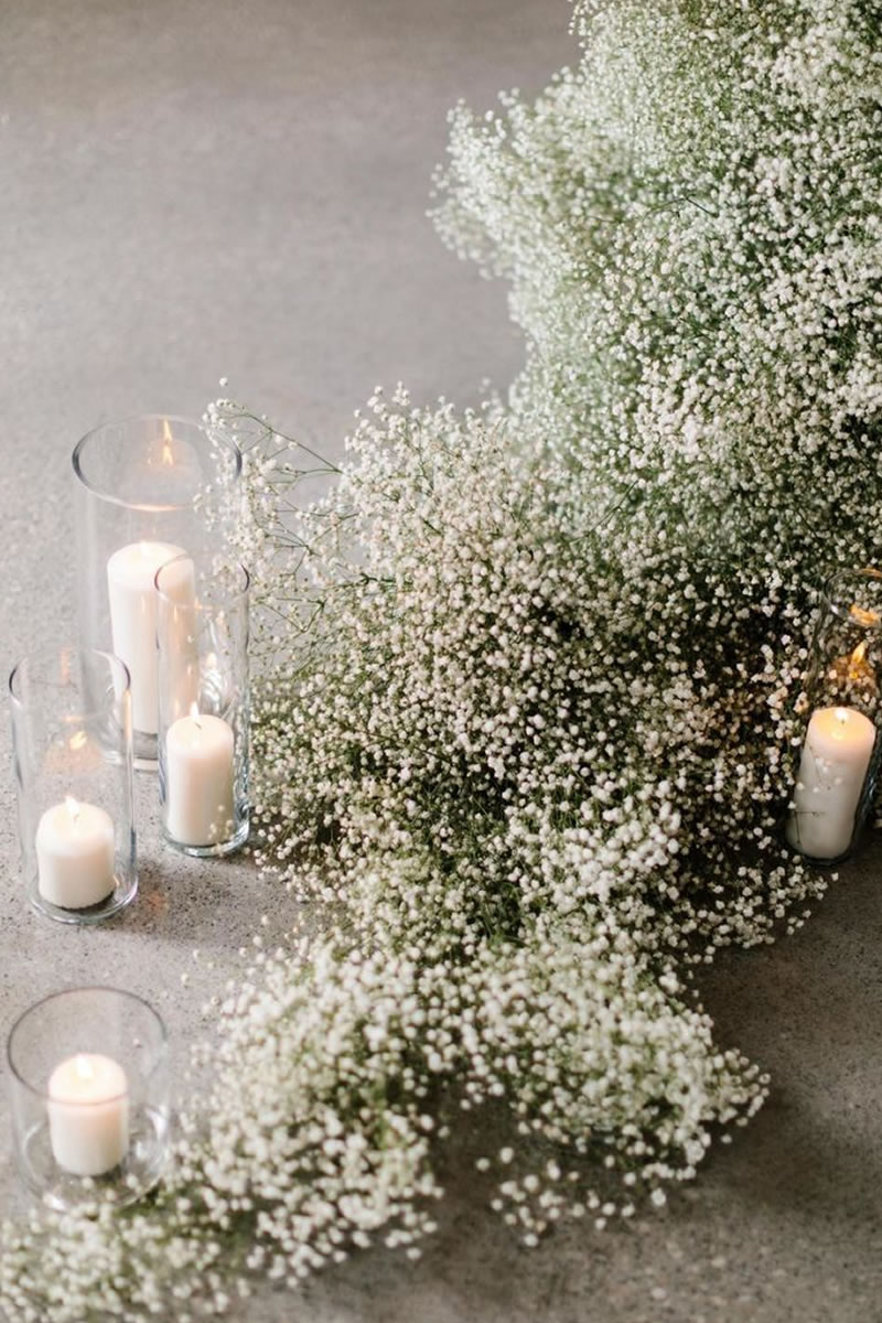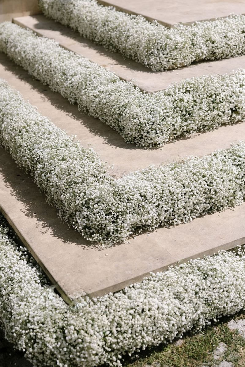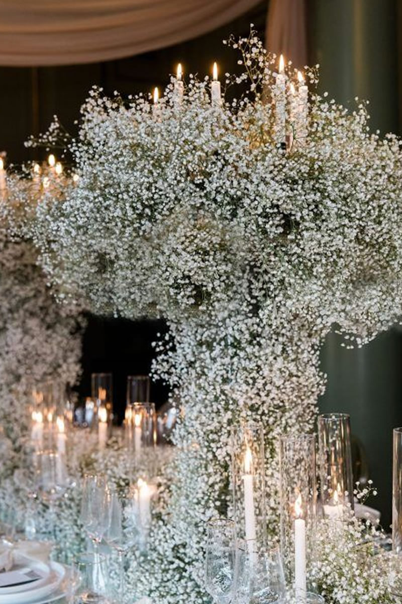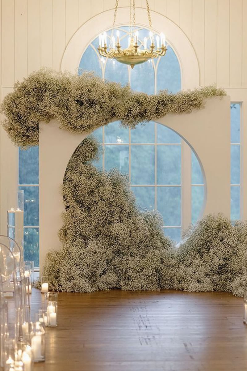 La paniculata se puede usar de muchas maneras en una boda, incluyendo la decoración de la ceremonia, por ejemplo, como marcadores de pasillo y arreglos para el altar; para la decoración de la recepción a través de centros de mesa, guirnaldas, estructuras flotantes o adornos para el pastel, incluso en ramos, azahares y coronas de flores. Dependiendo de la estética de la celebración, podrás lograr un ambiente romántico, rústico o elegante. Dale un vistazo a estas ideas.