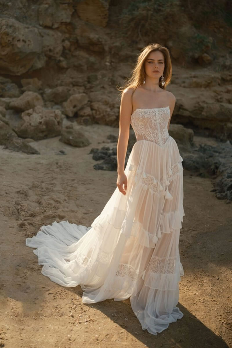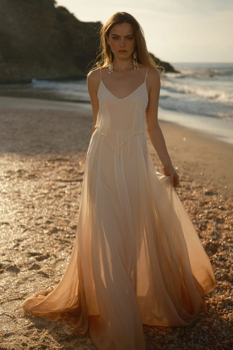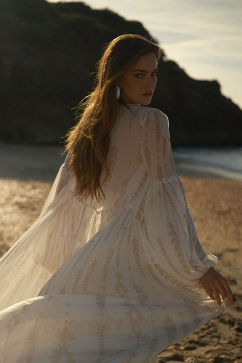 La colección “Wind Whisperer”, de RISH Bridal, se inspira en el suave movimiento del aire, con telas que flotan y se mueven al caminar. Con siluetas sencillas, texturas suaves y prendas ligeras, la belleza de estas piezas no solo se ve, sino que se siente.