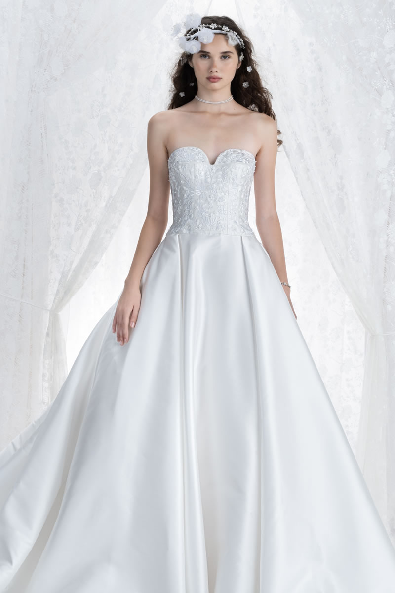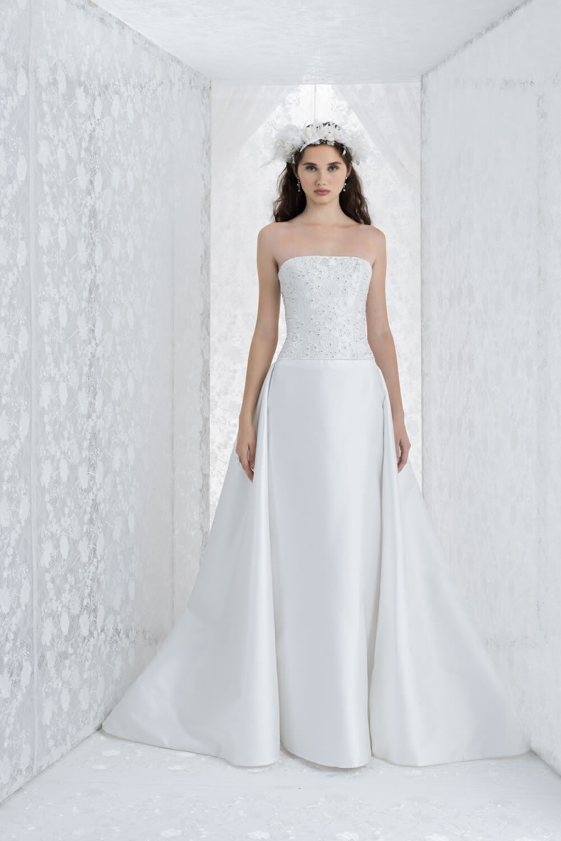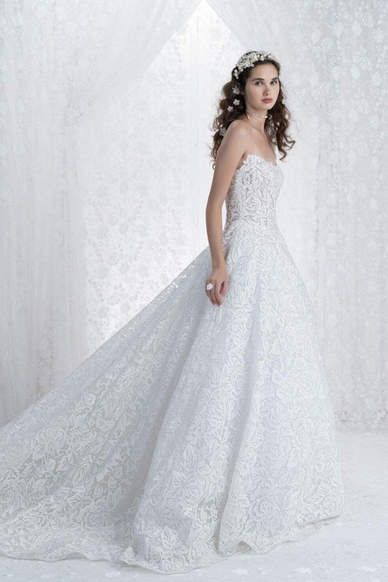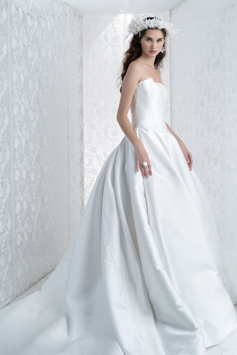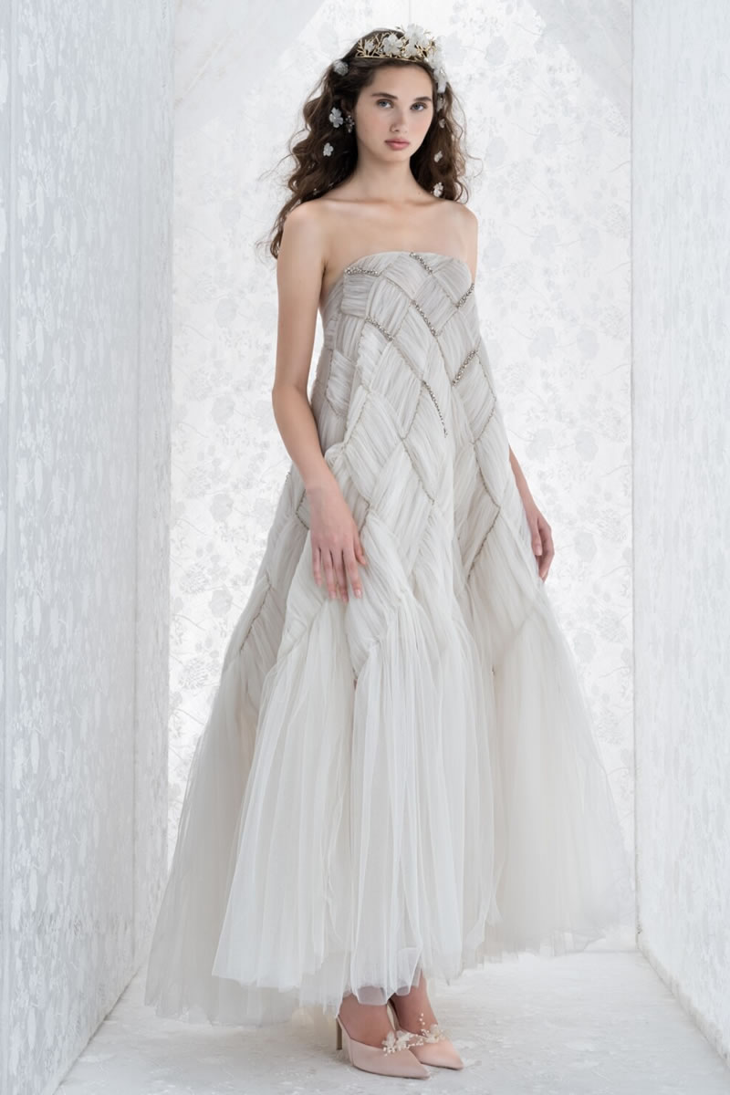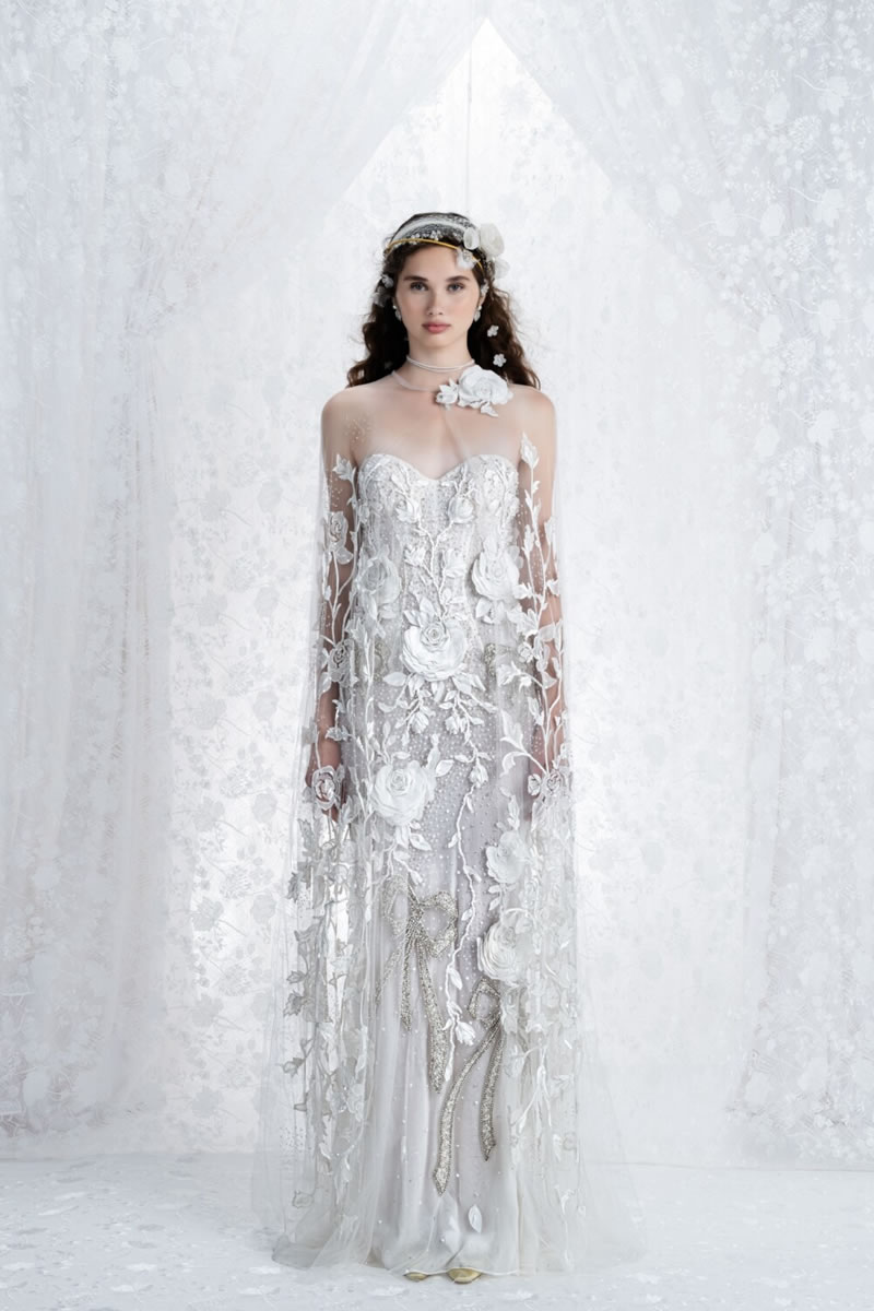 Voluminosas faldas, capas amplias, cortes al bies fluidos y los intrincados bordados, el sello favorito de la marca, definen esta nueva propuesta etérea y luminosa. La paleta es completamente blanca, bañada por una luz plateada y un sutil matiz azul.