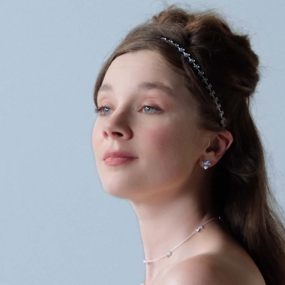 Flores elaboradas con detalles minuciosos, que en su momento se usaban para enviar mensajes secretos de amor, se combinan con perlas y moños en tonos pastel, incluido el característico lila de las glicinas que decoran el universo visual de Bridgerton. Desde ear climbers hasta collares, las piezas pueden mezclarse y combinarse de distintas maneras, invitando a la creatividad y a la autoexpresión.