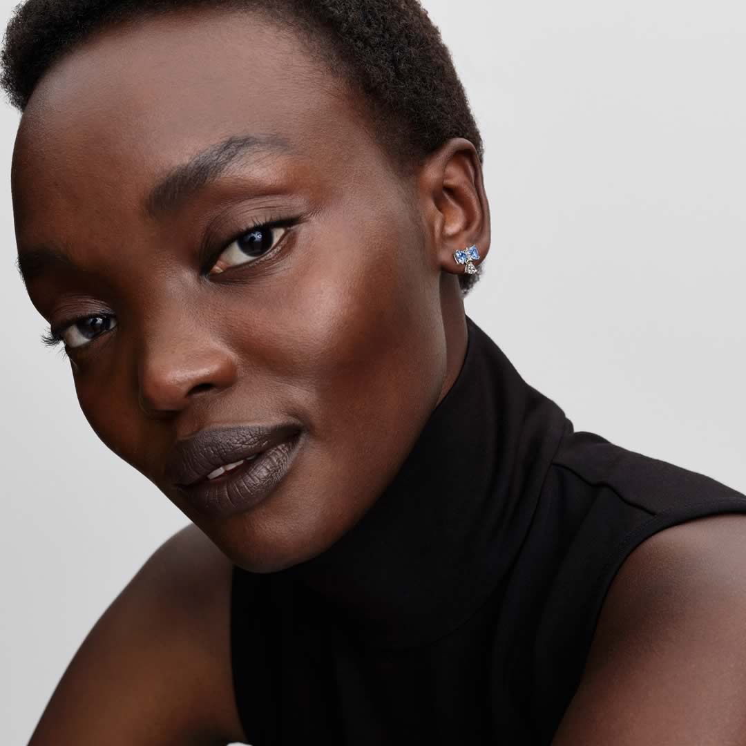 El clásico moño Bridgerton aparece como acento final en un arete que recorre la oreja, y un charm en forma de bolsita de té, con gemas incrustadas, añade un guiño divertido al estilo Lady Whistledown.