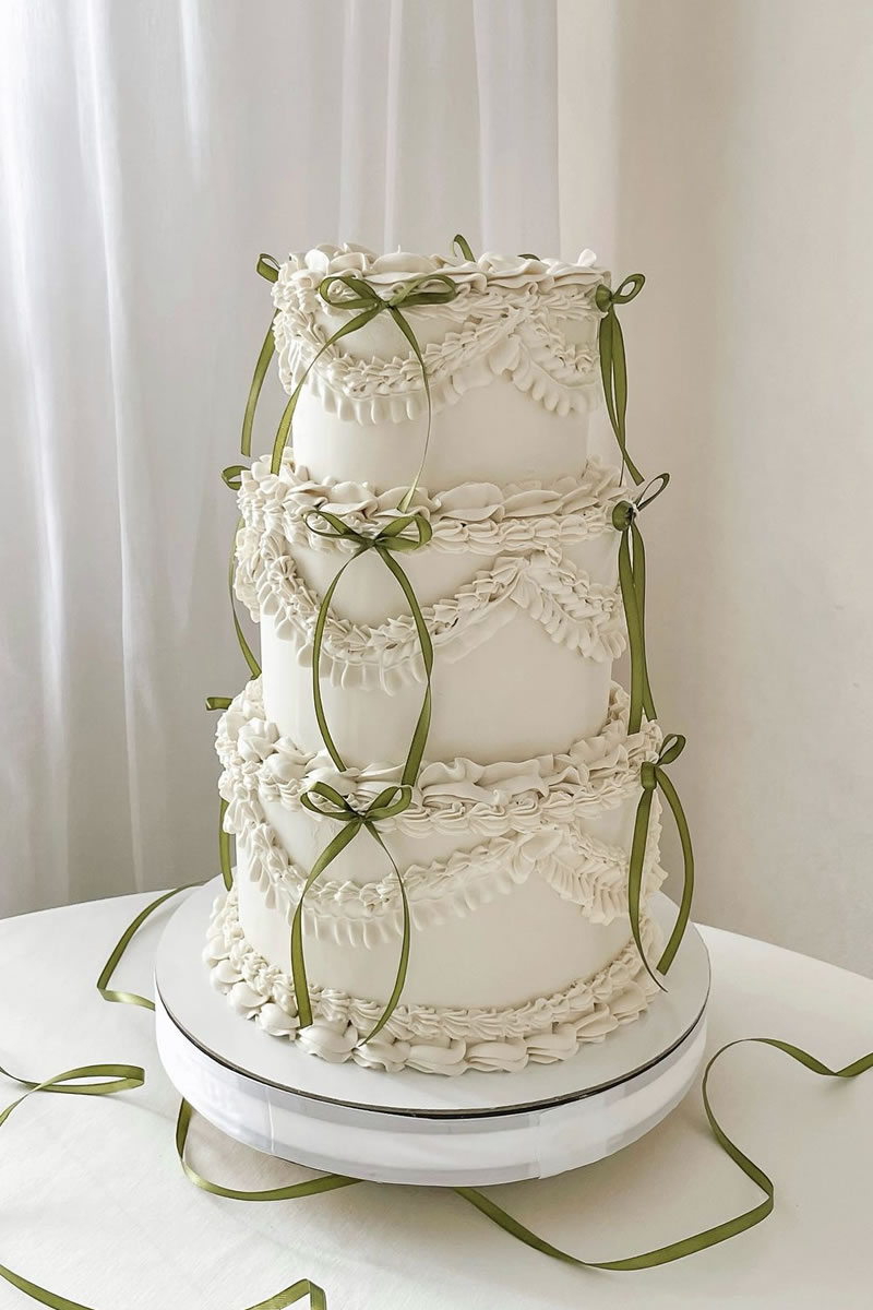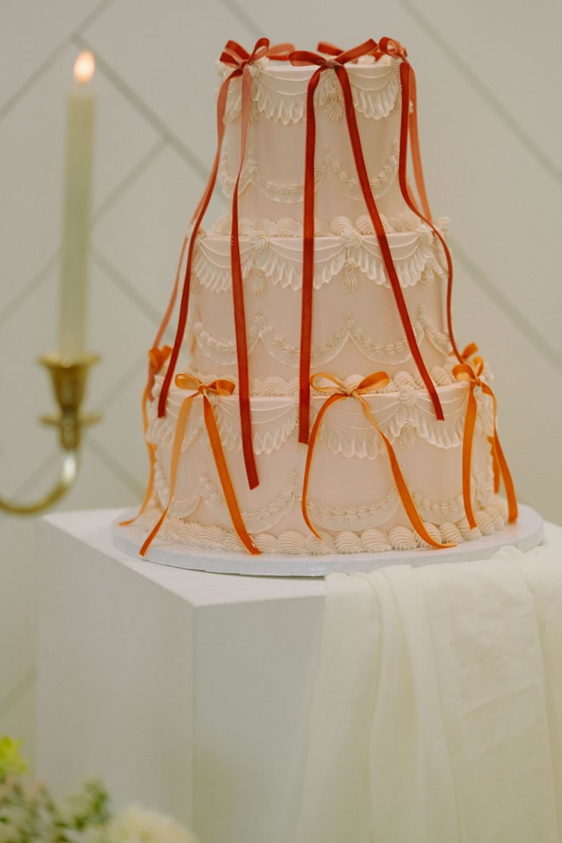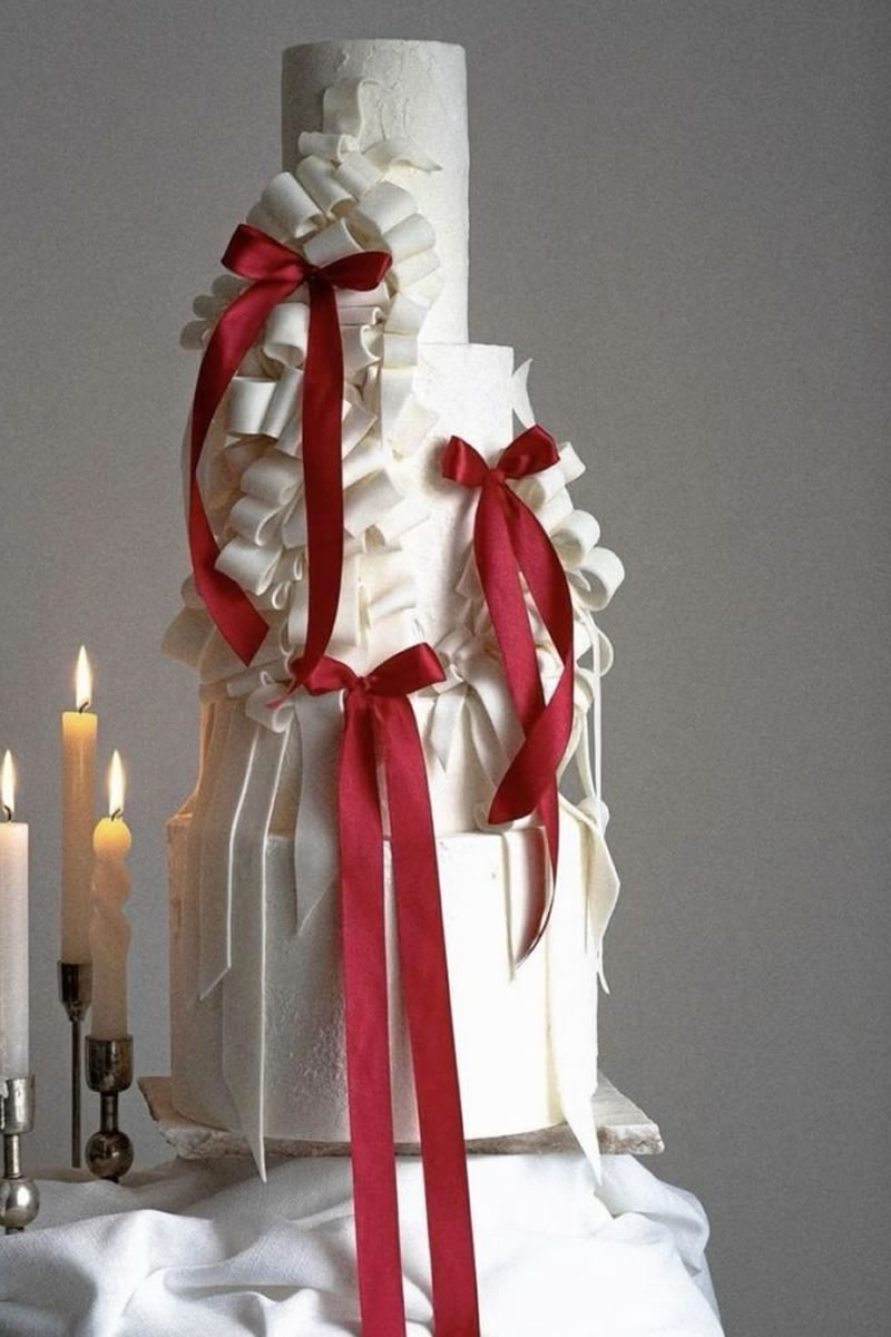 Los pasteles de boda decorados con listones de satén o terciopelo son la opción más popular. Se utilizan listones reales que se retiran al momento de cortar el pastel. El contraste de la textura suave del listón con el acabado del pastel (ya sea buttercream o fondant) se ve sumamente elegante. Muchos de estos pasteles siguen la técnica Lambeth, que es ese estilo de decoración vintage con muchas capas de holanes (piping) hechos con manga pastelera. Los pasteles con muchos holanes de crema y pequeños lazos rojos o rosas colocados estratégicamente en cada piso ¡son el look más viral del momento!