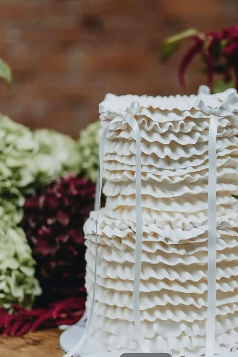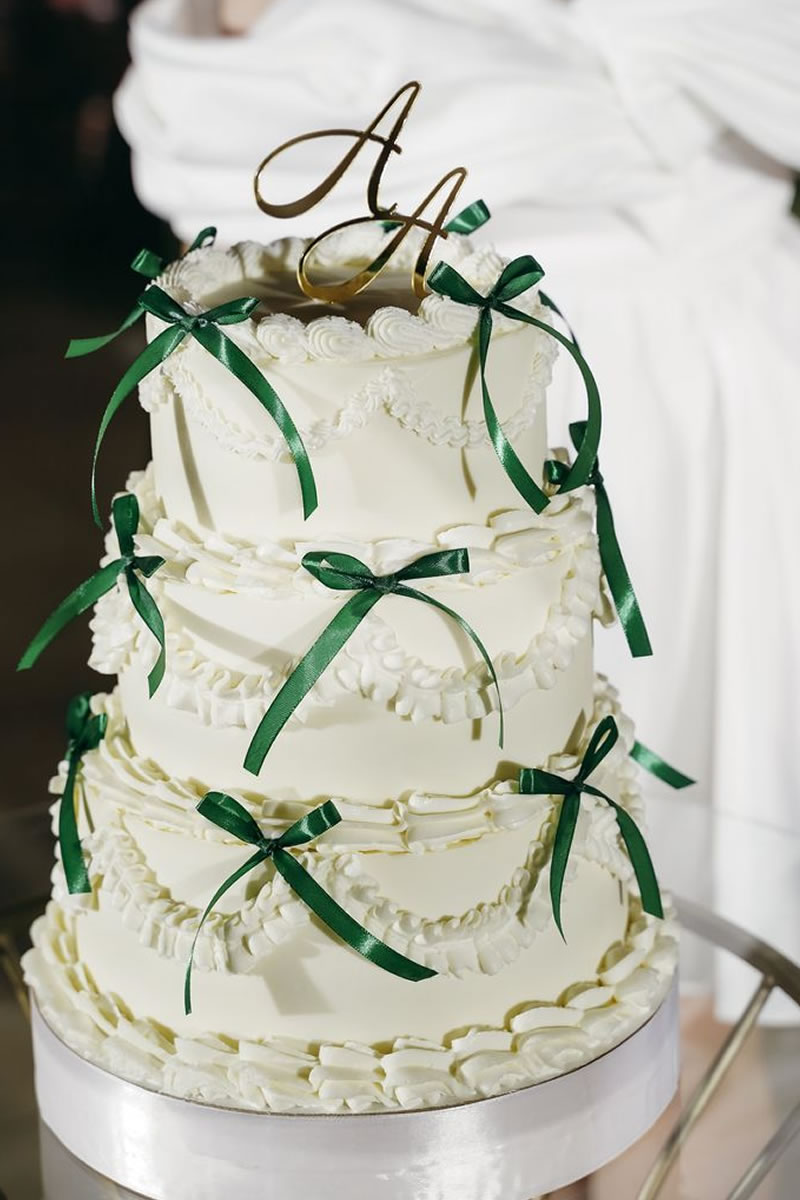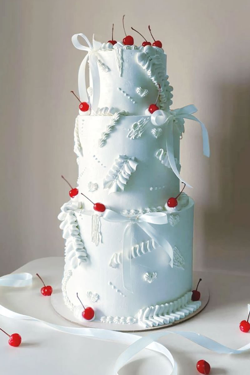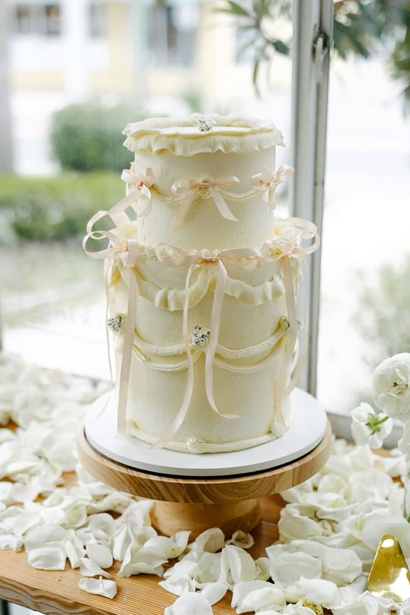 Los pasteles de boda decorados con listones de satén o terciopelo son la opción más popular. Se utilizan listones reales que se retiran al momento de cortar el pastel. El contraste de la textura suave del listón con el acabado del pastel (ya sea buttercream o fondant) se ve sumamente elegante. Muchos de estos pasteles siguen la técnica Lambeth, que es ese estilo de decoración vintage con muchas capas de holanes (piping) hechos con manga pastelera. Los pasteles con muchos holanes de crema y pequeños lazos rojos o rosas colocados estratégicamente en cada piso ¡son el look más viral del momento!
