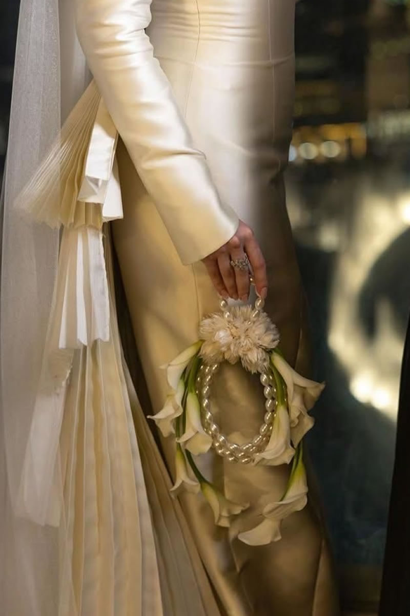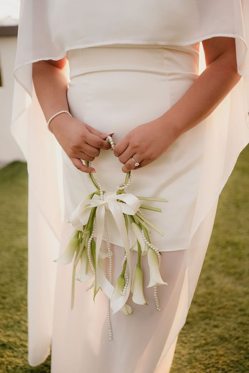 El hoop bouquet o ramo de aro consiste, como su nombre lo indica, en un aro de metal dorado, madera o bambú, decorado parcialmente con flores y follaje. Es una opción muy ligera, puedes llevarlo colgado de la muñeca o del antebrazo, lo que te permite tener las manos libres para sostener tu copa de champagne, saludar o sostener la mano de tu pareja sin soltar las flores. Tiene un aire muy etéreo y bohemio. Al no estar apretados por el calor de las manos (como un ramo tradicional), las flores suelen sufrir menos estrés y marchitarse más lento. Después de la ceremonia, muchas novias cuelgan su ramo de aro detrás de sus sillas en el banquete. Se convierte automáticamente en parte de la decoración de la recepción. Fotográficamente son un sueño. Permiten poses distintas y lucen muy bien desde cualquier ángulo. Dale un vistazo a estas ideas y elige tu favorito.