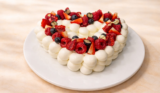 Merengue: monta las claras de huevo junto con la azúcar refinada hasta obtener una consistencia firme y brillante, agrega el azúcar glass previamente tamizada de forma envolvente para no perder aire, coloca el merengue en una manga y duya sobre un tapete de silicón formando un corazón. Hornea a 80 °C durante 1 hora con 15 minutos hasta que el merengue esté seco por fuera y ligero.