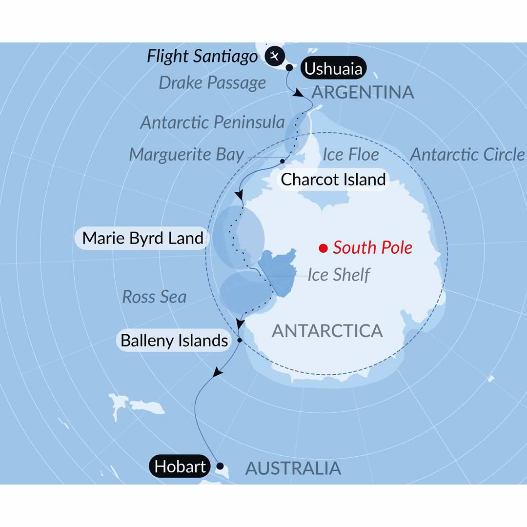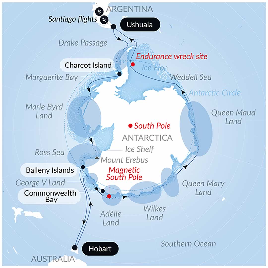 El itinerario contempla una primera etapa de 30 días desde Ushuaia, Argentina, hasta Hobart, Tasmania, navegando hacia el oeste a lo largo de la costa antártica. Tras una escala de tres días, la embarcación emprenderá el regreso siguiendo la costa oriental del continente durante 31 días adicionales hasta regresar a Ushuaia. Esta estructura permite realizar la circunnavegación completa o reservar uno de los dos tramos de manera independiente.