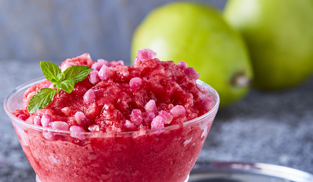 Licúe las frambuesas, peras, hielo y jarabe; mezcle con la granada y sirva de inmediato.