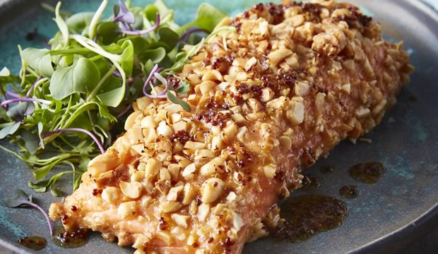 Salpimiente el salmón, enharínelo ligeramente, páselo por el huevo y después por los cacahuates picados. Colóquelos en una charola para horno con papel encerado y hornee a 180°C por 12 minutos.