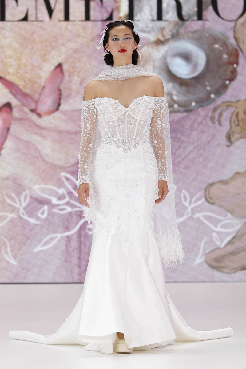 En la pasada edición de Barcelona Bridal Fashion Week, Demetrios presentó una colección que abraza una mezcla armoniosa de romance moderno y elegancia atemporal. Espere cinturas vascas esculpidas, telas ricas y una gama de looks limpios, desde la fluidez del crepé y el tafetán hasta la sofisticación estructurada del mikado y la organza. Notas del pasado se entrelazan con el arte contemporáneo, creando siluetas que se sienten tanto nostálgicas como refrescantemente modernas.