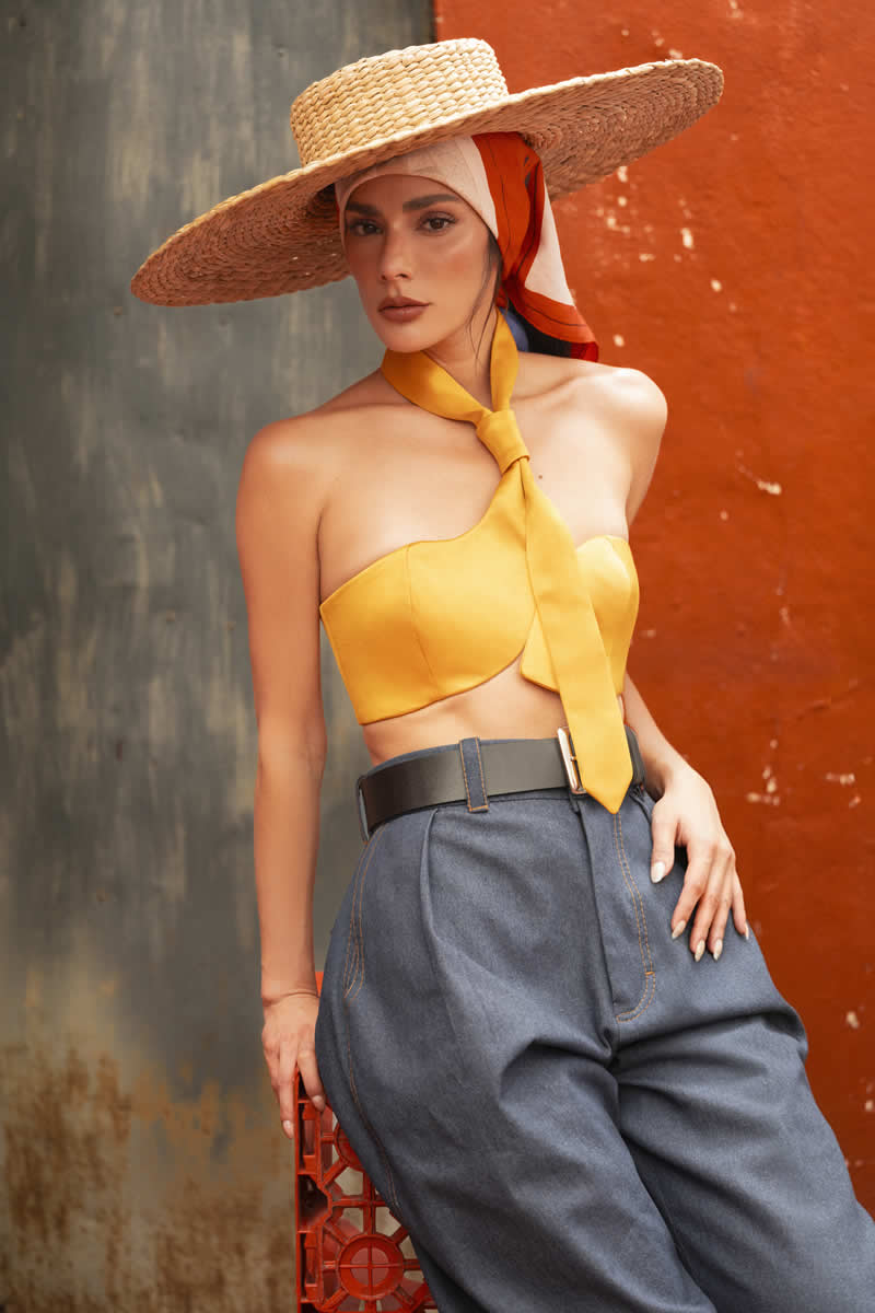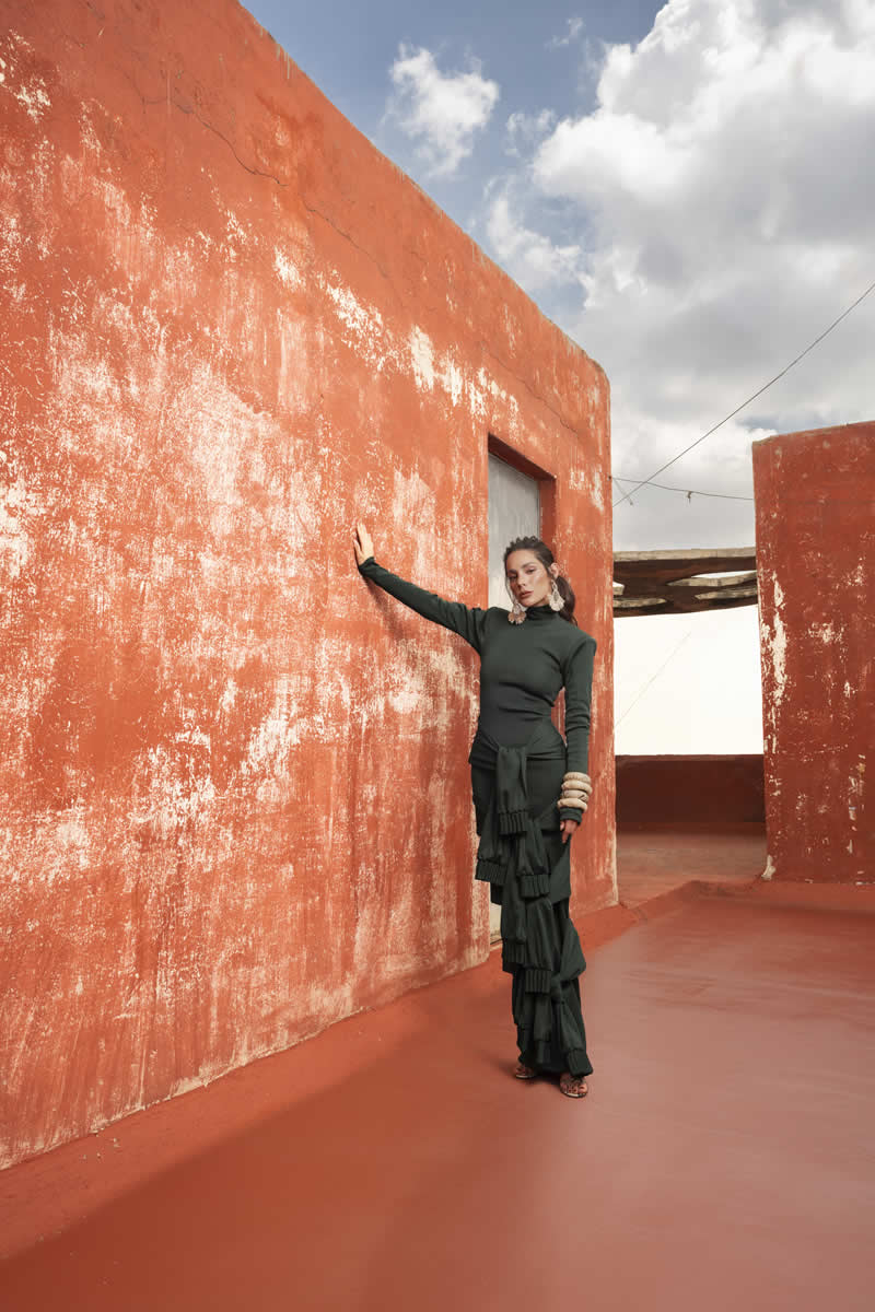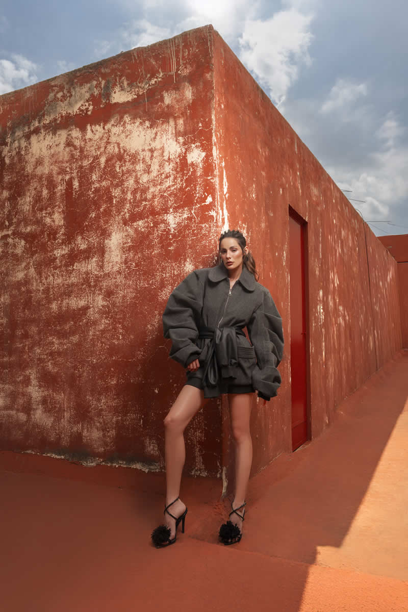 Inspirada en su niñez y en los contrastes de su tierra natal, la colección fusiona materiales nobles, como cuero, crepé, algodón y lana, con una paleta sobria pero emocional, que juega con texturas y contrastes para construir una narrativa visual de resiliencia y belleza. Las siluetas, cuidadosamente estructuradas, van desde vestidos escultóricos que exaltan la feminidad hasta prendas oversize que reinterpretan la fuerza desde la vulnerabilidad. La campaña visual, protagonizada por Oka Ginner, encarna la fuerza, elegancia y sensualidad que definen el universo de Bracho.