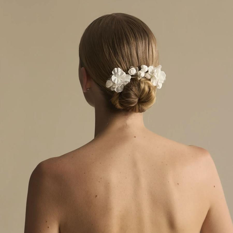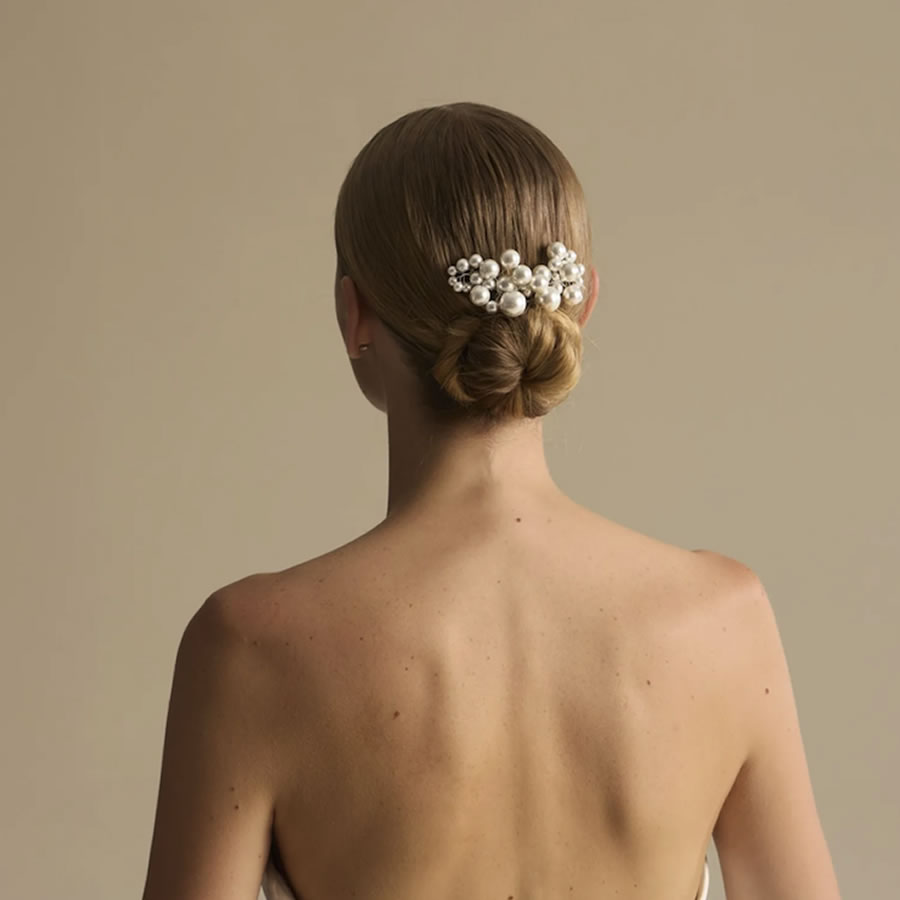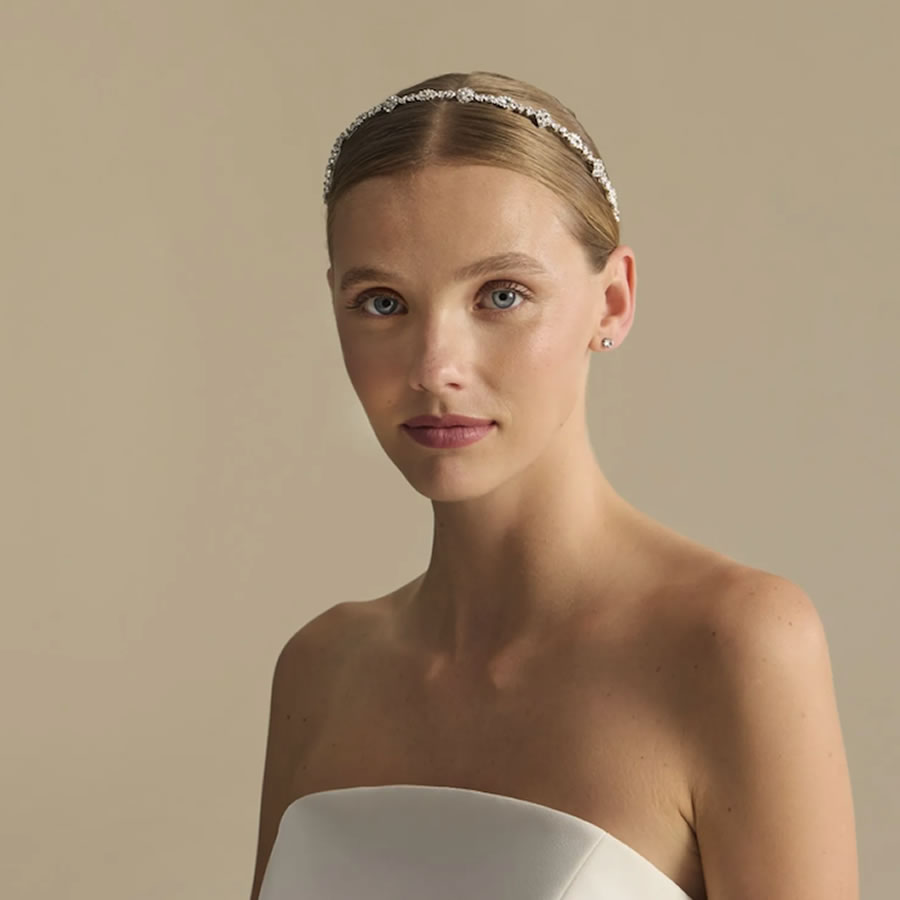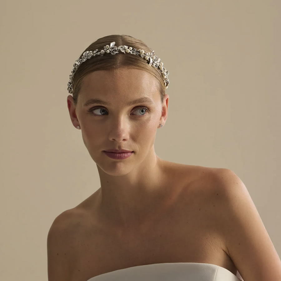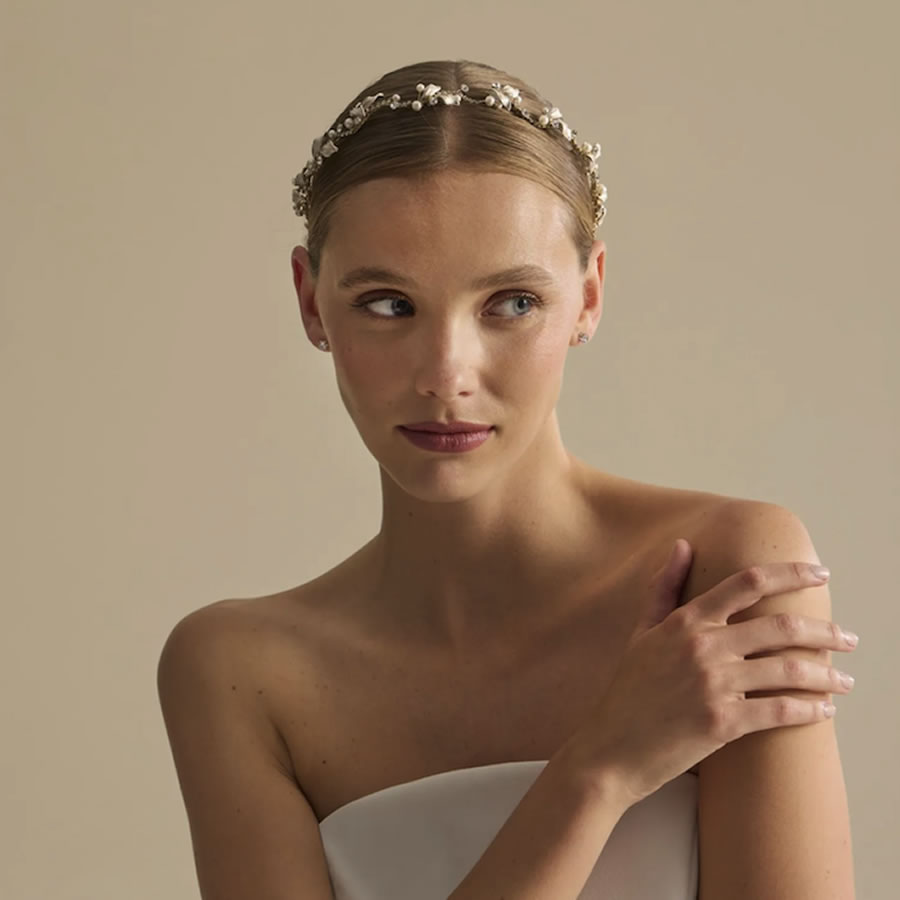 White One cuenta con una exquisita gama de diademas y broches, tiaras y exóticas coronas estilo diosa. Si planeas usar velo, sujétalo con delicadas horquillas de diamantes o una diadema con perlas incrustadas para un look más formal. Para bodas en la playa, ¡aumenta el romanticismo con una espectacular guirnalda floral!