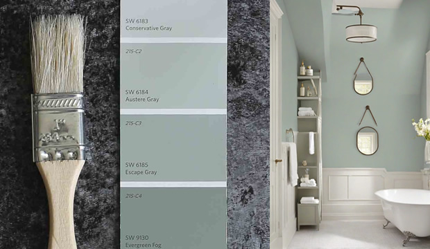 Evergreen Fog SW 9130, un verde grisáseo inspirado en la naturaleza, que crea una atmósfera envolvente y calmada, conectando el interior con sensaciones de equilibrio y bienestar.