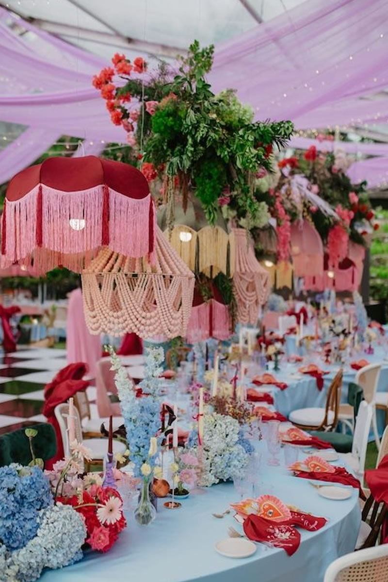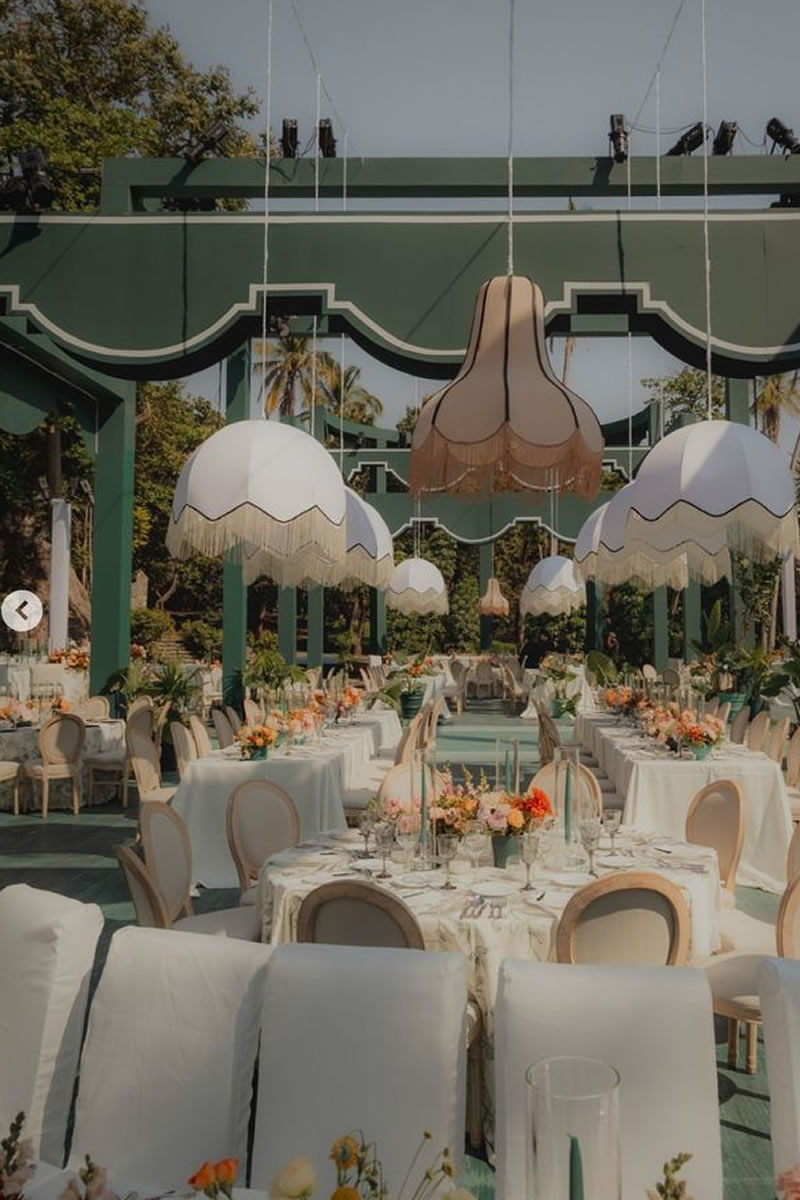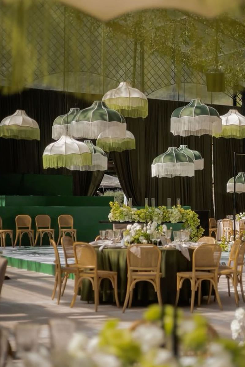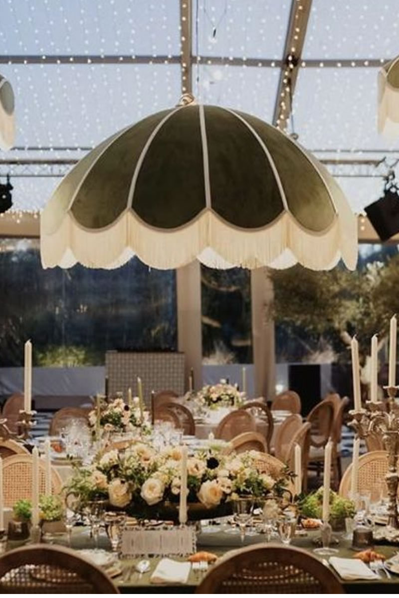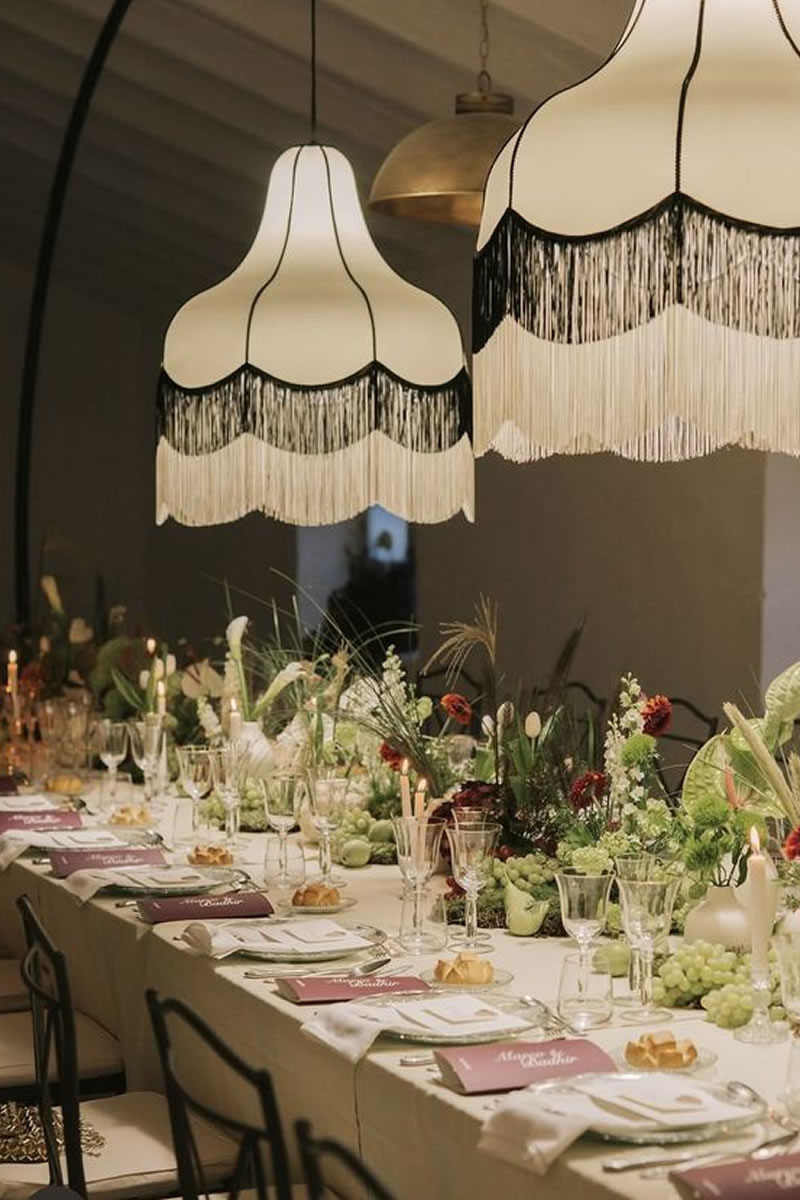 Las bodas ya no se decoran solo de la mesa hacia abajo, sino que ahora se crean «Paisajes de Techo» (ceiling landscapes). Este 2026, las recepciones se transforman bajo el suave vaivén de lámparas vestidas de flecos, una tendencia que recupera el glamour de los años 20 con un espíritu renovado. Más que simples fuentes de luz, estas pantallas textiles añaden movimiento, calidez y una textura casi hipnótica.