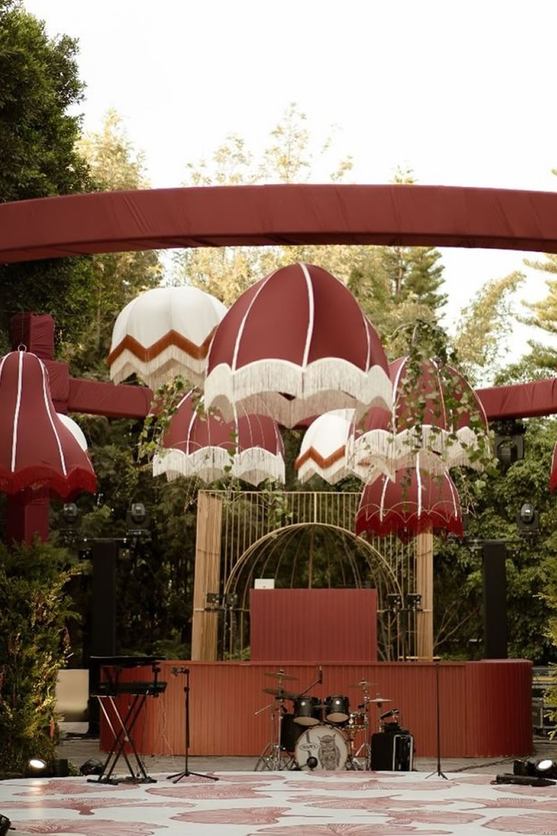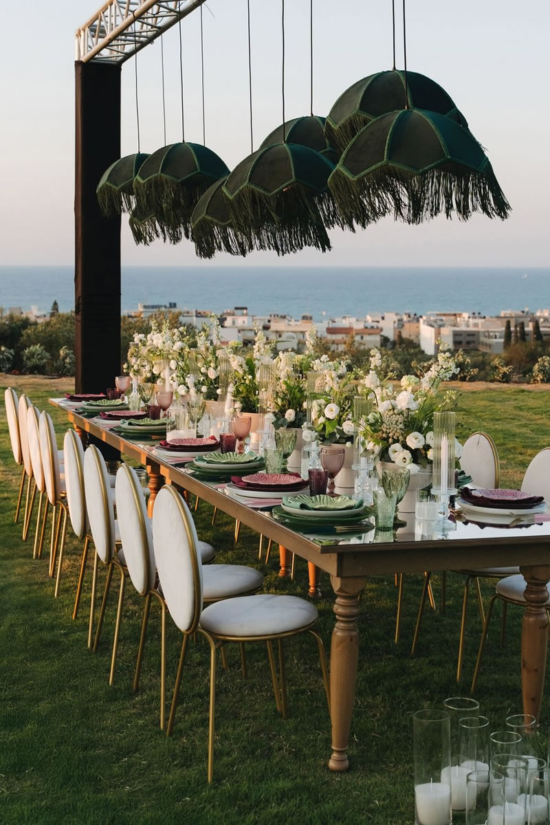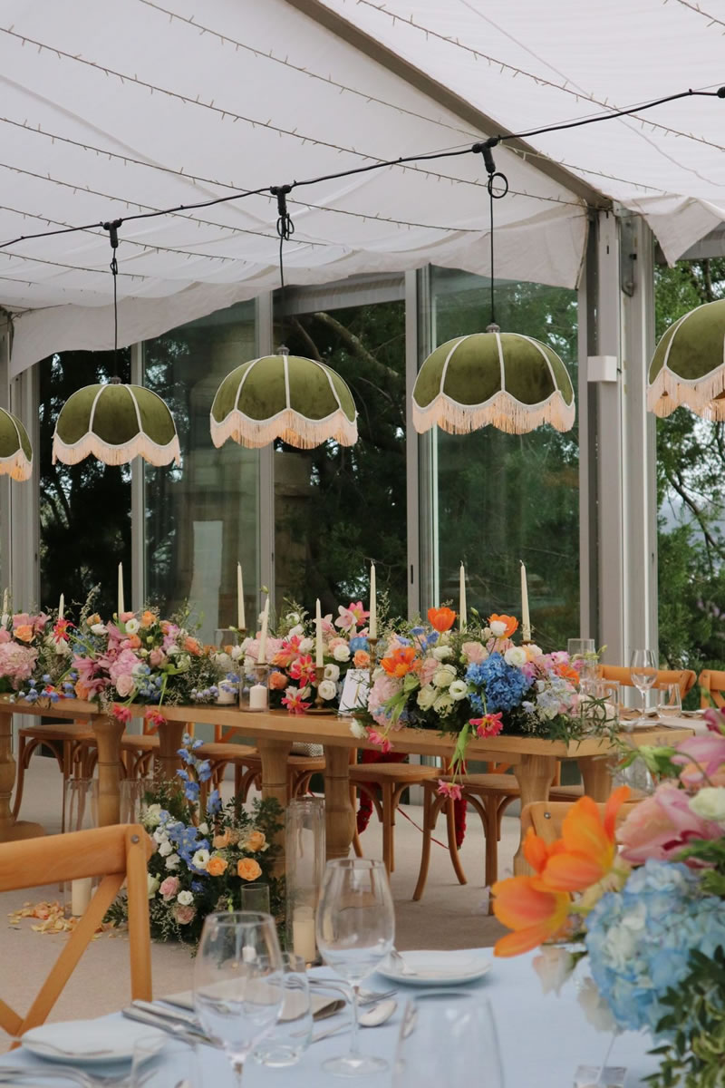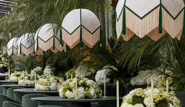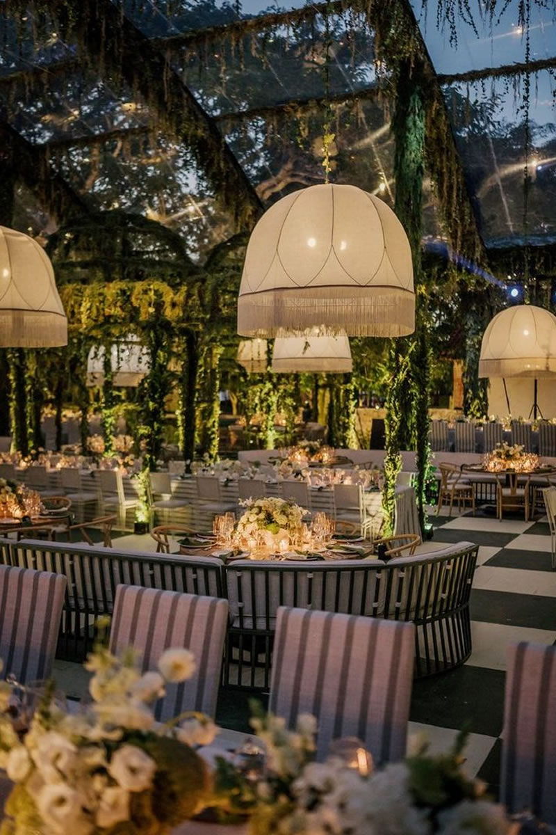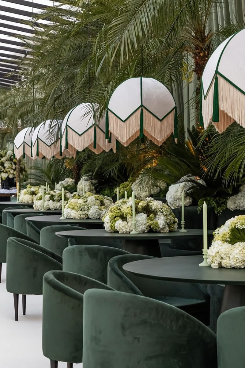 Las bodas ya no se decoran solo de la mesa hacia abajo, sino que ahora se crean «Paisajes de Techo» (ceiling landscapes). Este 2026, las recepciones se transforman bajo el suave vaivén de lámparas vestidas de flecos, una tendencia que recupera el glamour de los años 20 con un espíritu renovado. Más que simples fuentes de luz, estas pantallas textiles añaden movimiento, calidez y una textura casi hipnótica.