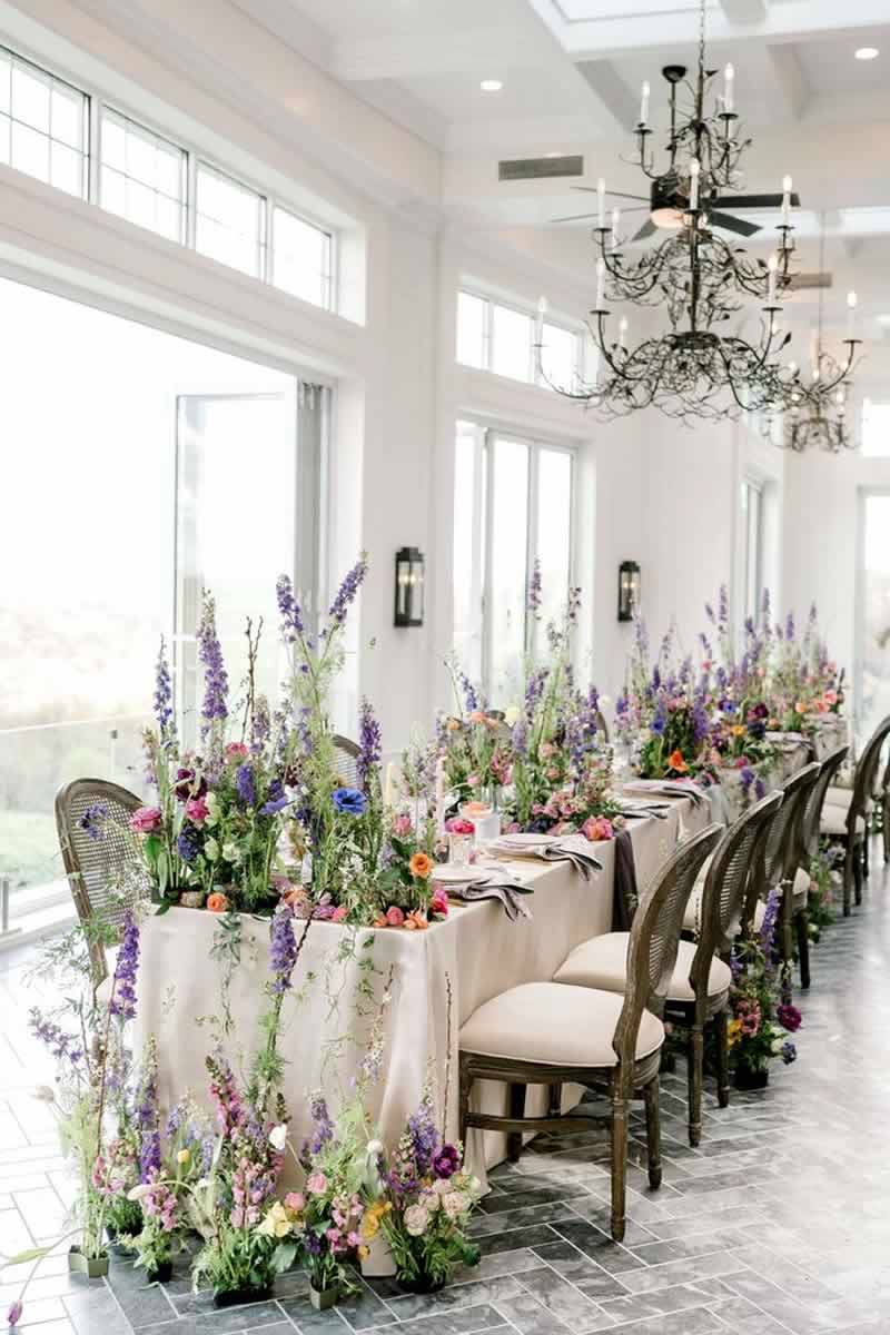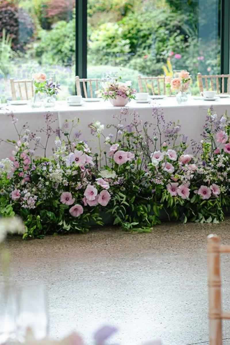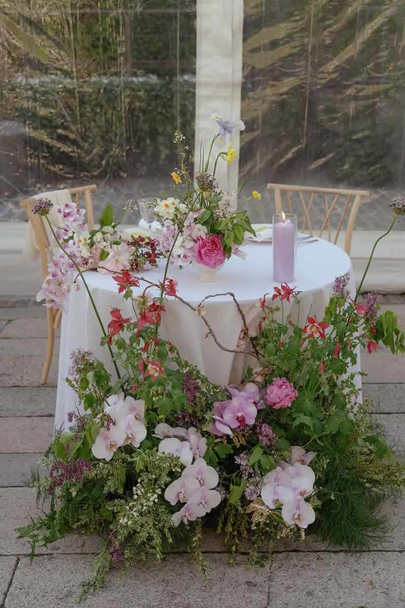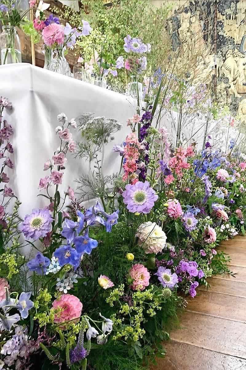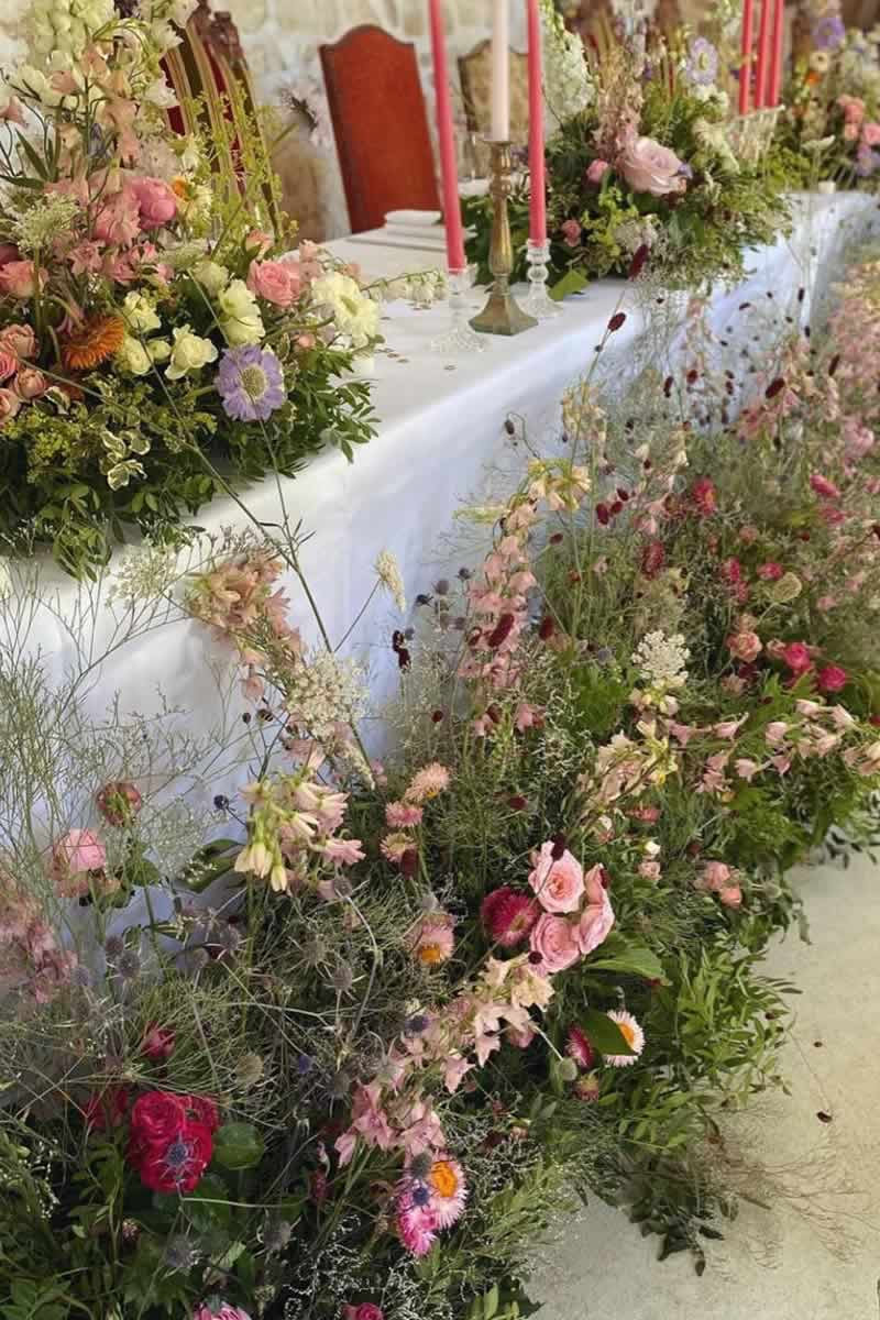 Esa modalidad donde parece que las flores están «plantadas» y crecen directamente desde el suelo se conoce técnicamente como meadow arrangement, arreglo de pradera o flores de piso. Aporta una sensación de abundancia y frescura, como si la boda se estuviera celebrando en un jardín secreto, incluso si es en un salón cerrado.