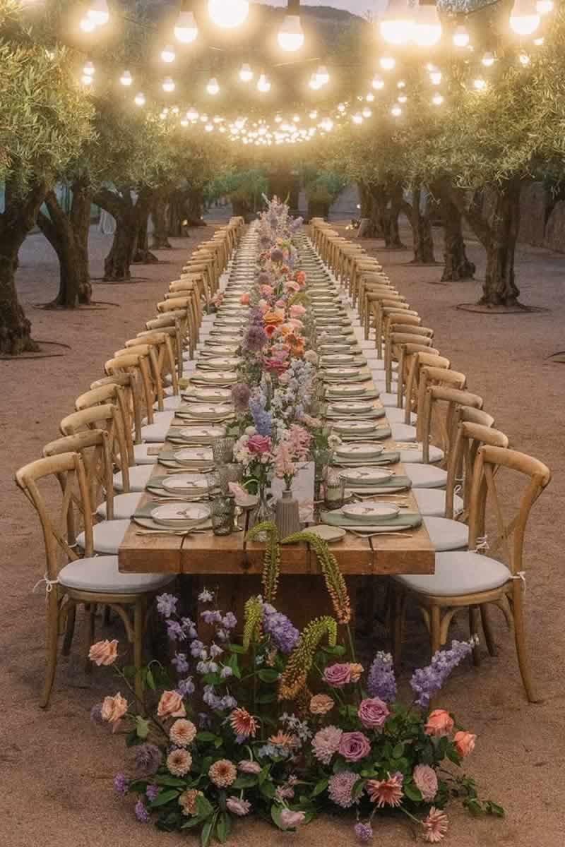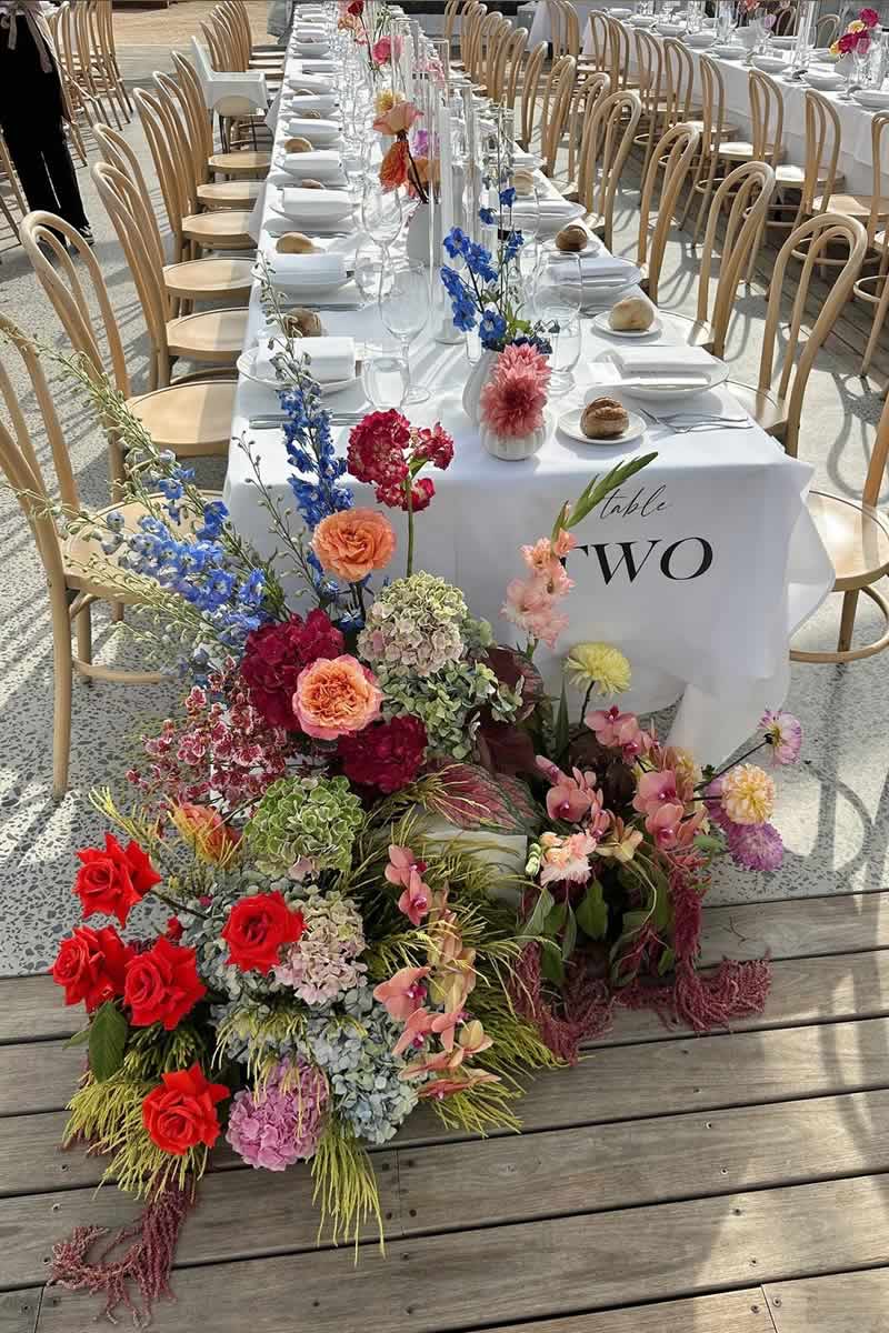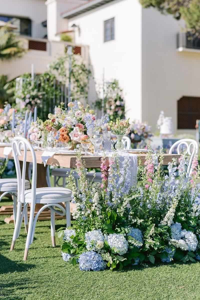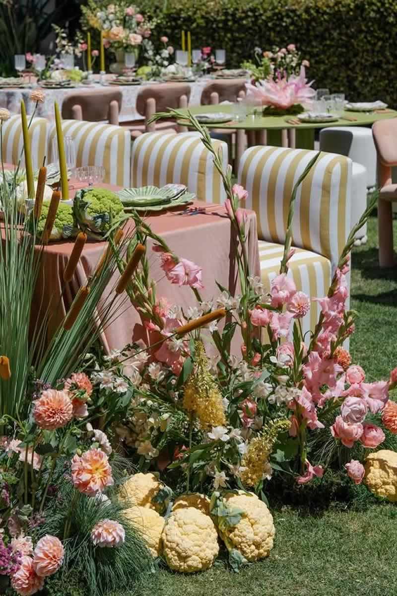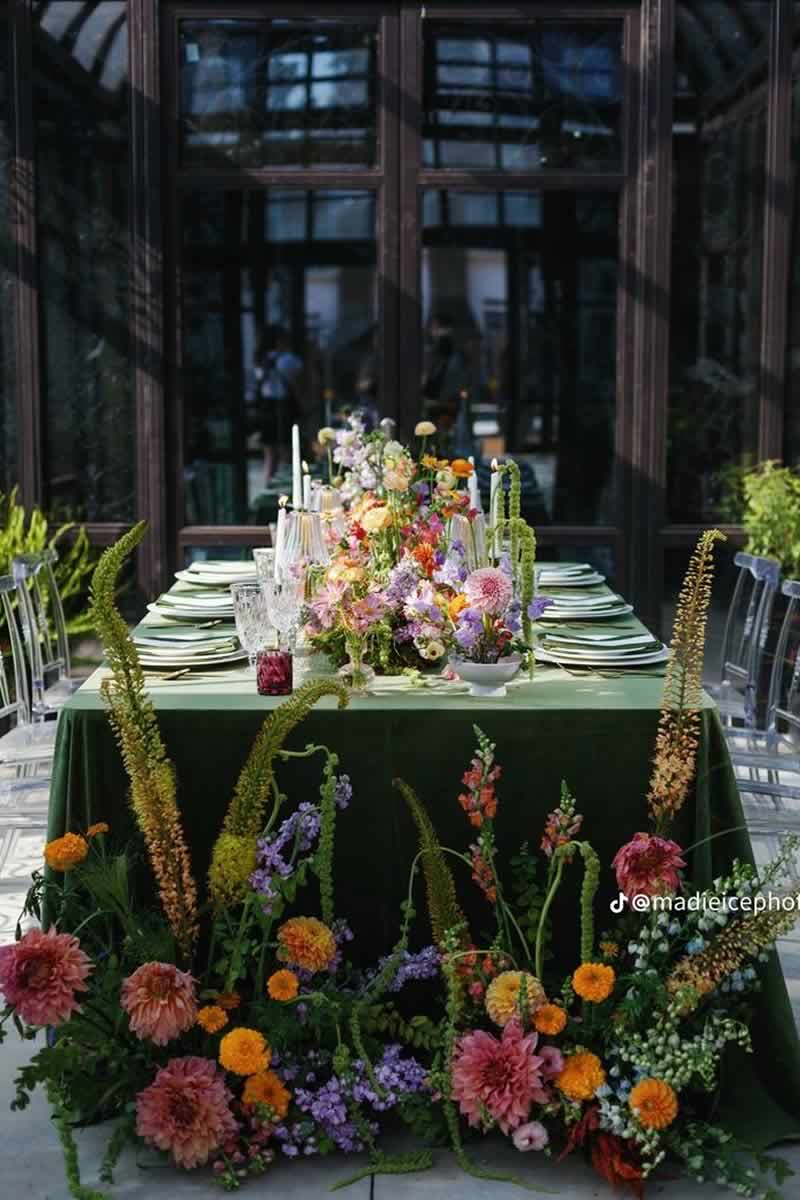 Esa modalidad donde parece que las flores están «plantadas» y crecen directamente desde el suelo se conoce técnicamente como meadow arrangement, arreglo de pradera o flores de piso. Aporta una sensación de abundancia y frescura, como si la boda se estuviera celebrando en un jardín secreto, incluso si es en un salón cerrado.