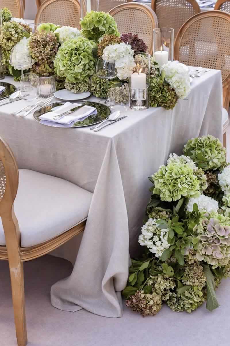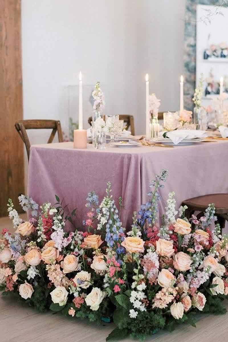 Este concepto busca imitar la naturaleza de la forma más fiel posible. No se ve el florero ni la base; las flores emergen en grupos, creando un efecto de «camino» o «crecimiento espontáneo». Es ideal para las cabeceras de los novios o mesas imperiales largas. Al estar en el suelo, no obstruyen la vista entre los invitados y las fotografías de la pareja quedan enmarcadas por flores sin que nada les tape la cara. Si buscas algo romántico y moderno, este estilo es la opción ganadora, especialmente si tienes un espacio amplio. Algo más: asegúrate de que el diseño sea lo suficientemente robusto para que no parezca que «se cayeron» unas flores, sino que realmente tienen una intención estética.