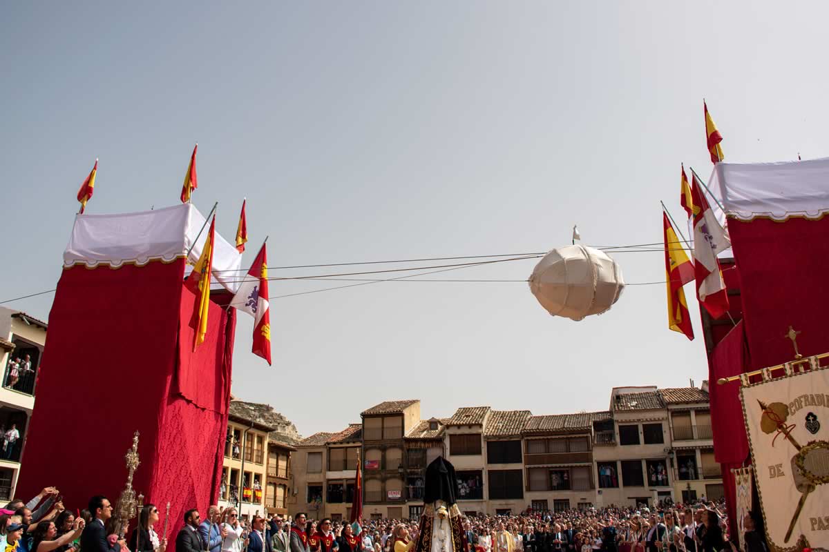 La peculiaridad de la plaza es extraordinaria. Los balcones que se asoman a ella, adintelados, se realizaron en los siglos XVIII y XIX, en madera, decorados con motivos arabescos de hojas, flores y frutos en lo que se conoce como «guardamalleta». Pero más curioso aún es el «derecho de vistas» o «servidumbre de balcón», un derecho medieval que permite a los propietarios de los balcones disfrutarlos durante los festejos, aunque no sean dueños de la vivienda. Este privilegio pervive hasta nuestros días, testimonio vivo de cómo las costumbres ancestrales se mantienen en la vida cotidiana del pueblo. Allí, entre vigas de madera centenarias y el aroma a lechazo que ya empieza a escaparse de los vecinos hornos, ocurre algo que roza lo mágico: un niño vestido de ángel desafía la gravedad para anunciar que la tristeza se ha acabado.