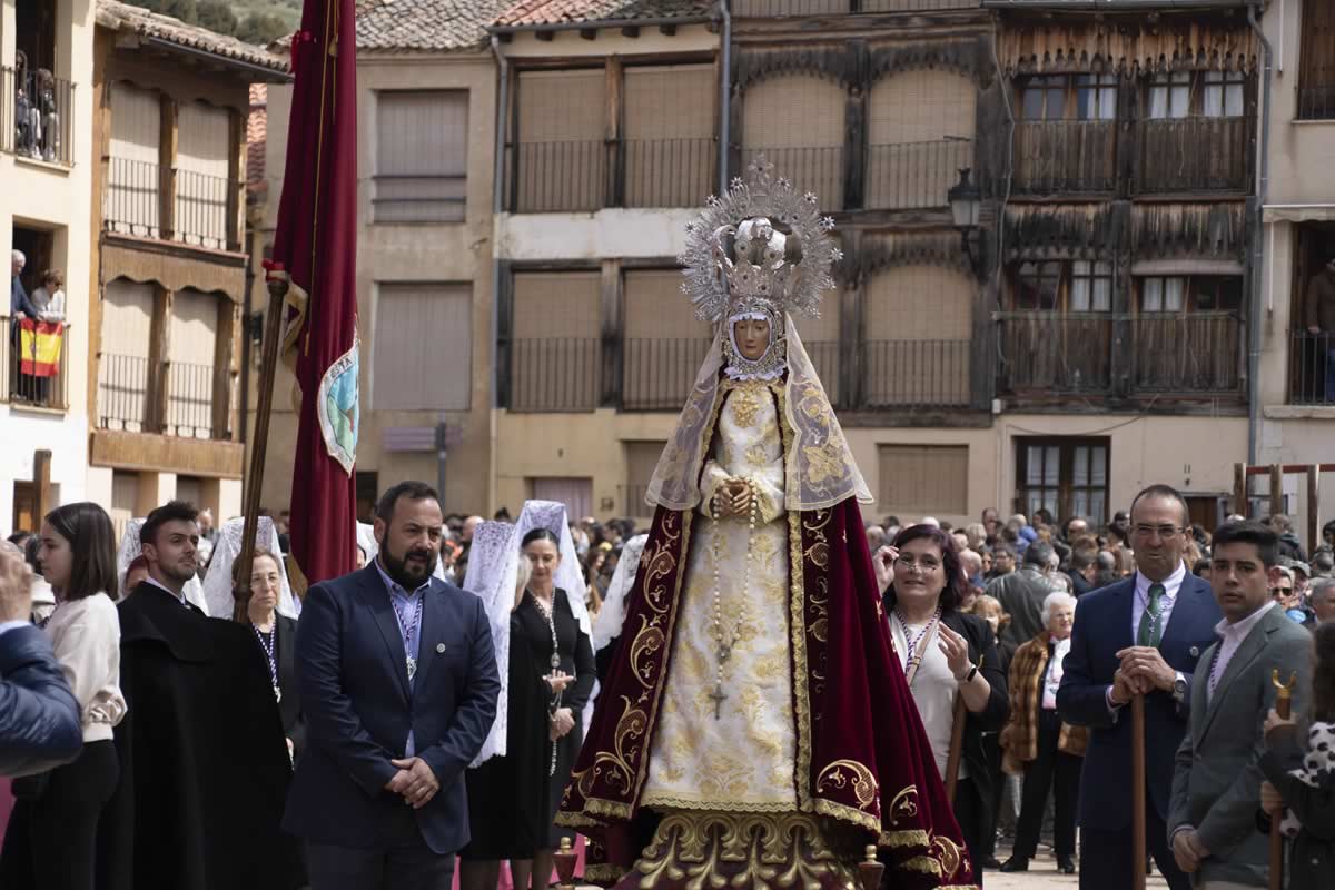 El Domingo de Resurrección, cuando las campanas y los cohetes rompen el silencio de la mañana, comienza una de las celebraciones más esperadas del año. La imagen de la Virgen sale de la iglesia de Santa María cubierta con un velo negro, símbolo del luto por la muerte de su hijo. Acompañada por cofrades, mayordomos y fieles, la procesión se dirige lentamente hacia la Plaza del Coso.
