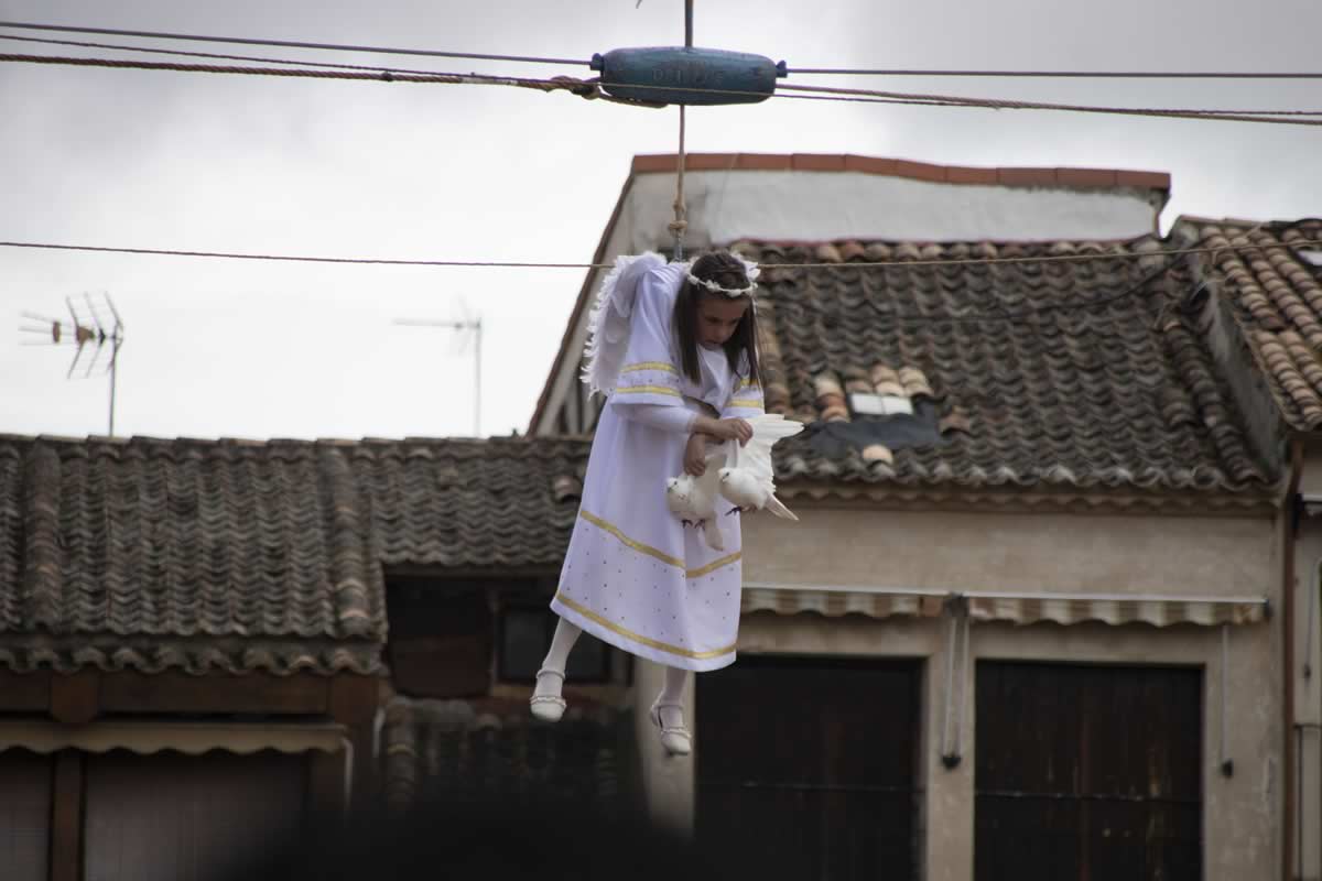 Entonces sucede la magia y tiene lugar una escena que parece salida de un relato antiguo: un ángel desciende desde lo alto para anunciar al mundo la Resurrección de Jesús. Esta representación, mezcla de fe, teatro y tradición, convierte a Peñafiel en un lugar único durante la Semana Santa. El globo se abre en dos mitades dejando a la vista a un niño vestido de ángel, con hábito blanco, corona dorada y alas. Es un momento de suspensión temporal, donde el asombro infantil de generaciones pasadas se encuentra con la emoción de las presentes. El pequeño ángel comienza su descenso celestial, portando dos palomas blancas entre sus manos.