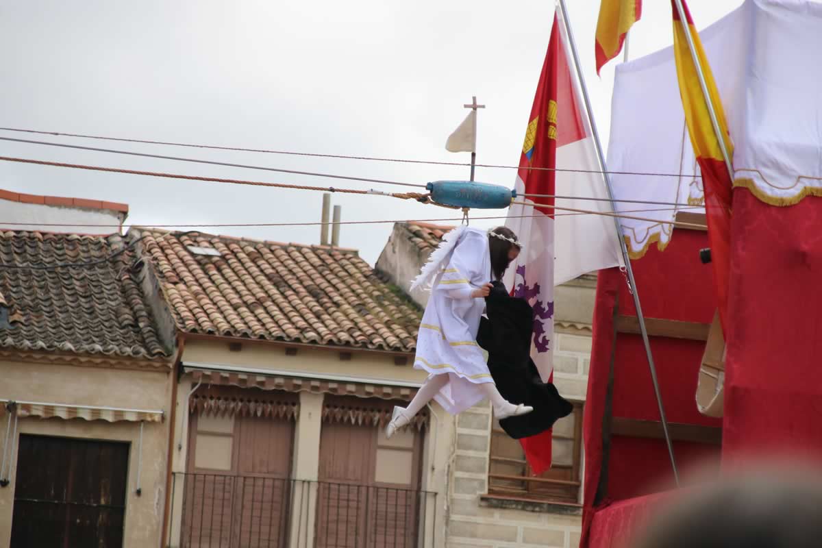 Gracias a un sistema de poleas, el ángel desciende colgado, suelta dos palomas y llega a entrar en contacto con la Virgen que se encuentra bajo él. Entonces le quita el velo negro a la enlutada madre de Cristo y es elevado otra vez pataleando. Este momento, aparentemente sencillo en su descripción, encierra una profunda carga emotiva y simbólica.