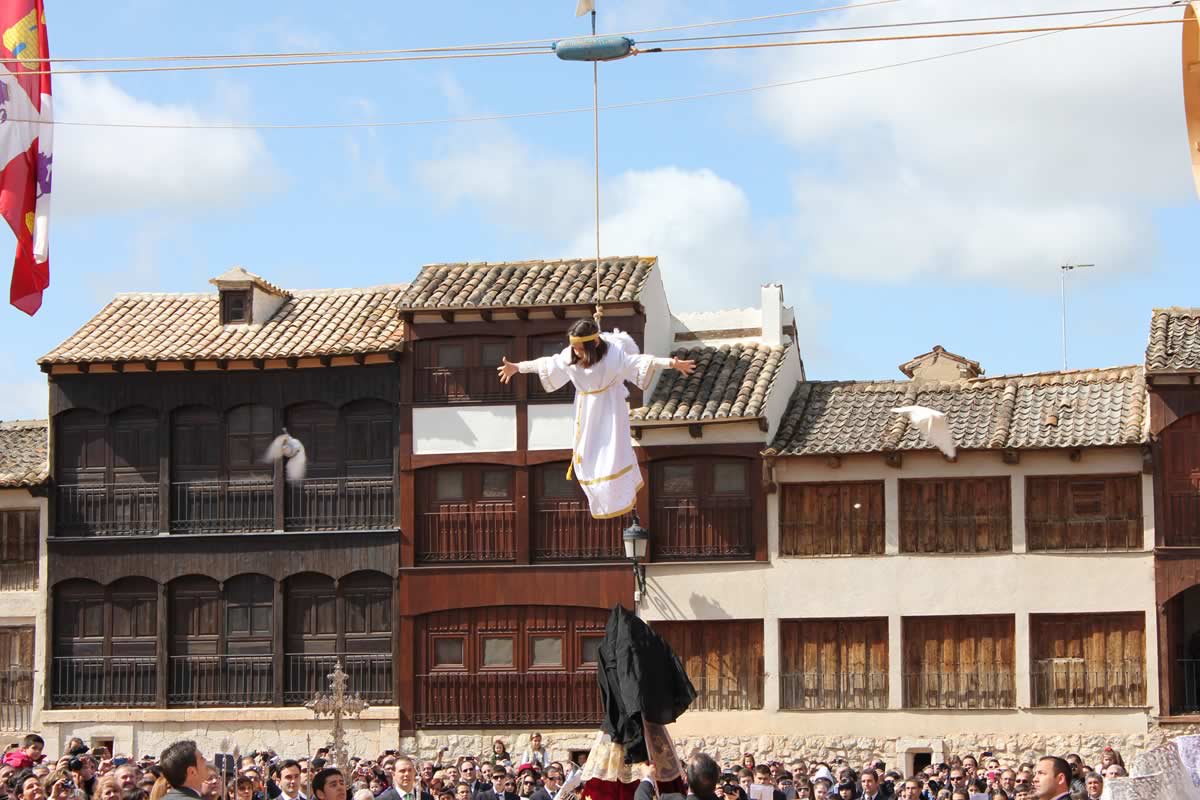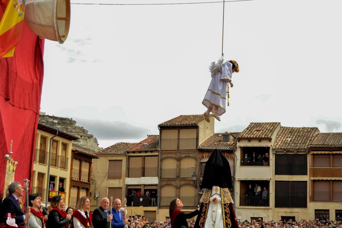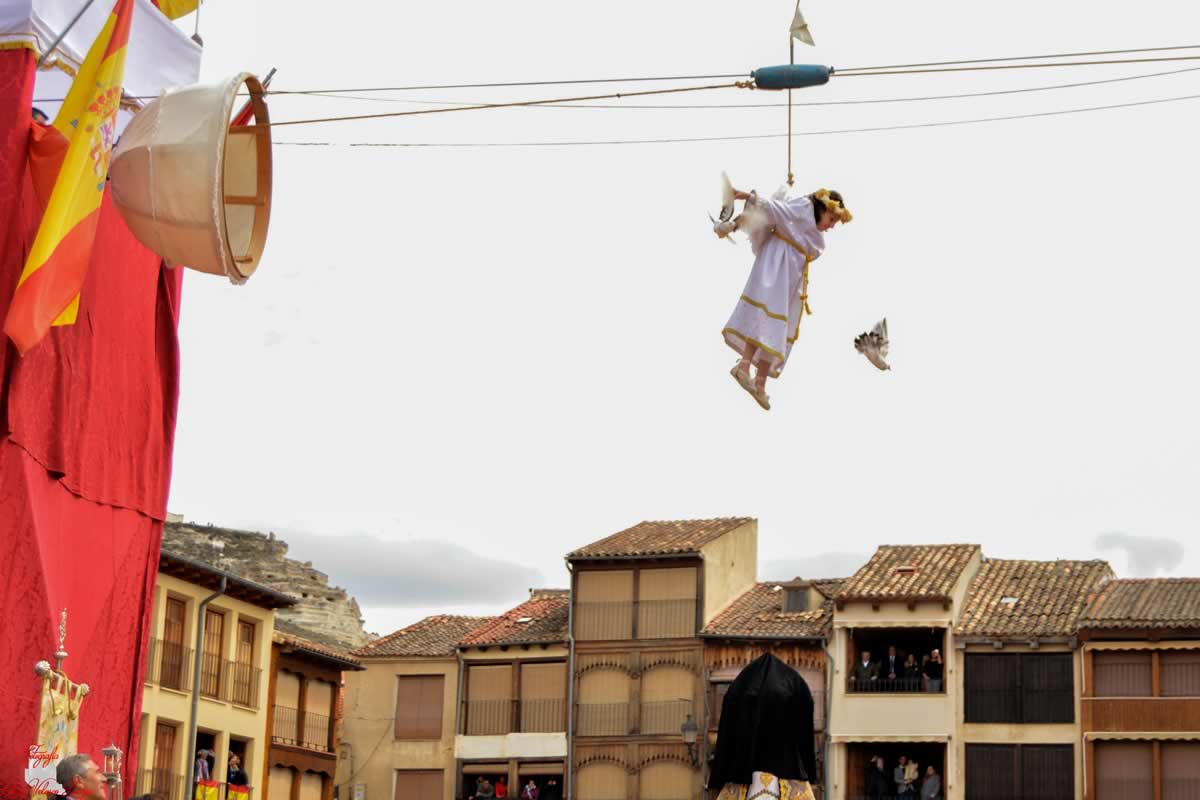 En Peñafiel, Valladolid, un pueblo español situado en el corazón de la Ribera del Duero de Castilla León, bajo la atenta mirada del imponente castillo que corona la colina con forma de barco, se celebra cada Domingo de Resurrección (5 abril 2026) una de las tradiciones más emotivas y singulares de la Semana Santa castellana. Es la representación del momento en que un ángel-niño desciende de los cielos para revelar a la Virgen María la Resurrección de su hijo, un espectáculo que congrega a miles de personas en la legendaria Plaza del Coso de Peñafiel.