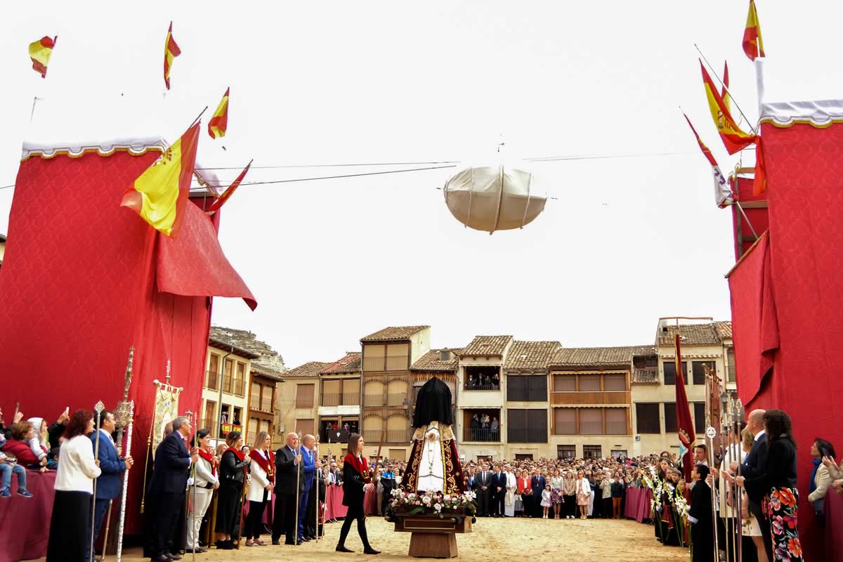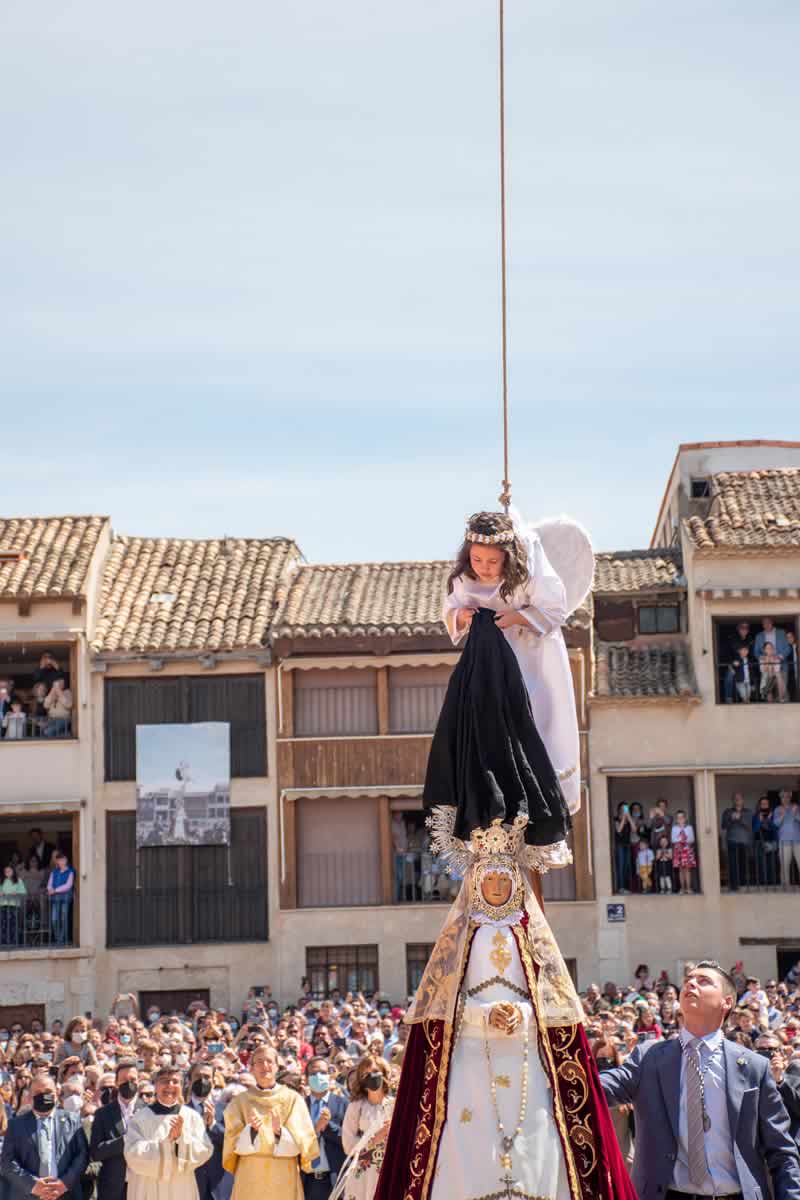 El Domingo de Resurrección, cuando las campanas y los cohetes rompen el silencio de la mañana, comienza una de las celebraciones más esperadas del año. La imagen de la Virgen sale de la iglesia de Santa María cubierta con un velo negro, símbolo del luto por la muerte de su hijo. Acompañada por cofrades, mayordomos y fieles, la procesión se dirige lentamente hacia la Plaza del Coso.