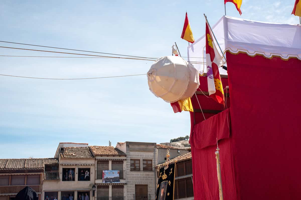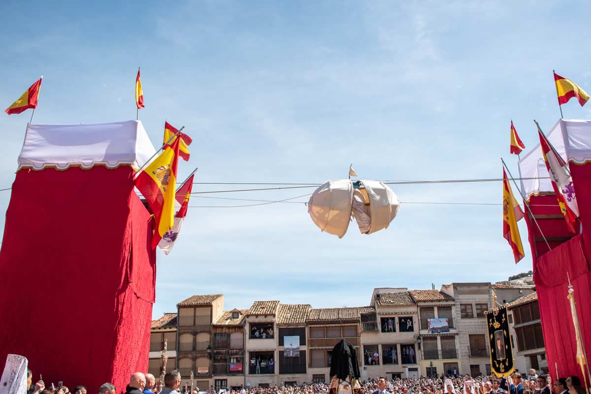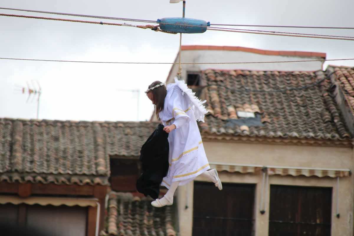 La peculiaridad de la plaza es extraordinaria. Los balcones que se asoman a ella, adintelados, se realizaron en los siglos XVIII y XIX, en madera, decorados con motivos arabescos de hojas, flores y frutos en lo que se conoce como «guardamalleta». Pero más curioso aún es el «derecho de vistas» o «servidumbre de balcón», un derecho medieval que permite a los propietarios de los balcones disfrutarlos durante los festejos, aunque no sean dueños de la vivienda. Este privilegio pervive hasta nuestros días, testimonio vivo de cómo las costumbres ancestrales se mantienen en la vida cotidiana del pueblo. Allí, entre vigas de madera centenarias y el aroma a lechazo que ya empieza a escaparse de los vecinos hornos, ocurre algo que roza lo mágico: un niño vestido de ángel desafía la gravedad para anunciar que la tristeza se ha acabado.