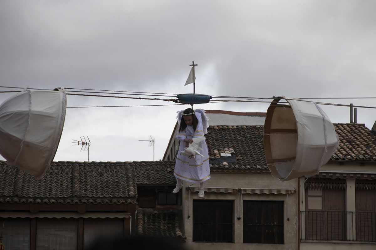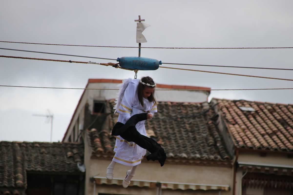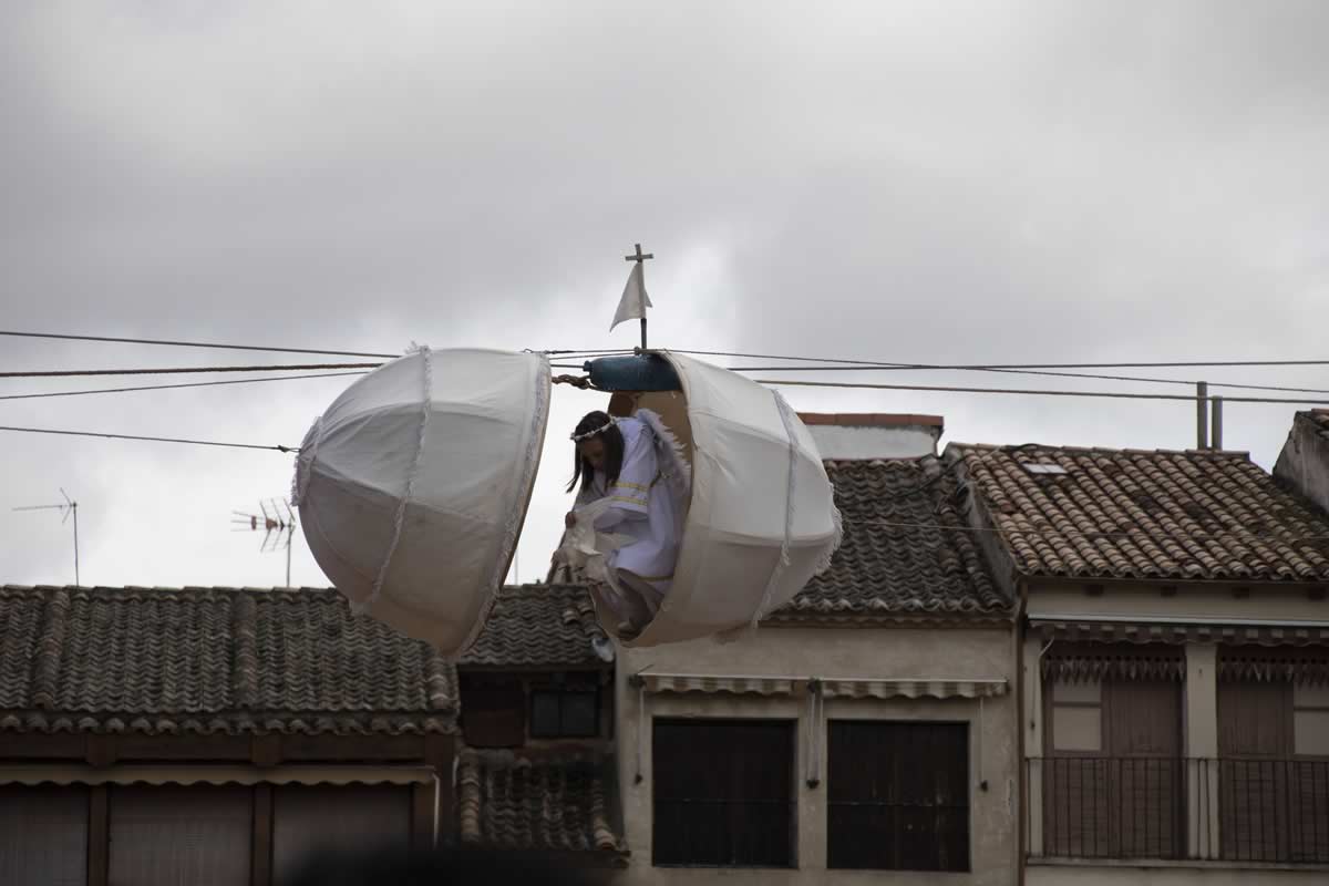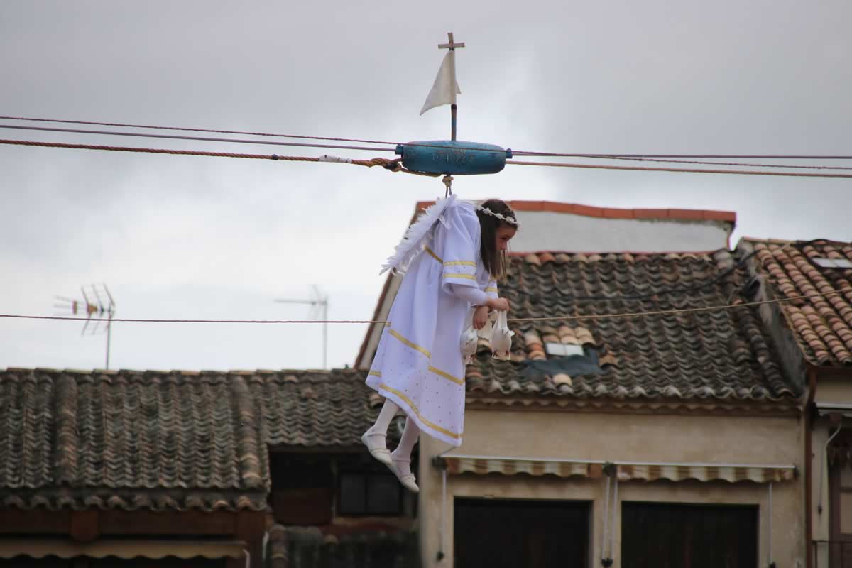 Entonces sucede la magia y tiene lugar una escena que parece salida de un relato antiguo: un ángel desciende desde lo alto para anunciar al mundo la Resurrección de Jesús. Esta representación, mezcla de fe, teatro y tradición, convierte a Peñafiel en un lugar único durante la Semana Santa. El globo se abre en dos mitades dejando a la vista a un niño vestido de ángel, con hábito blanco, corona dorada y alas. Es un momento de suspensión temporal, donde el asombro infantil de generaciones pasadas se encuentra con la emoción de las presentes. El pequeño ángel comienza su descenso celestial, portando dos palomas blancas entre sus manos.