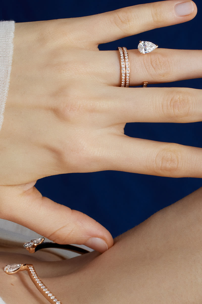 Se trata de una técnica que suspende el diamante mediante un engaste translúcido o elevado, creando la ilusión de que flota en el aire. Esta compleja estructura potencia el brillo mediante un fascinante juego lumínico. Dale un vistazo a esta galería de imágenes ¡y toma un poco de inspiración!