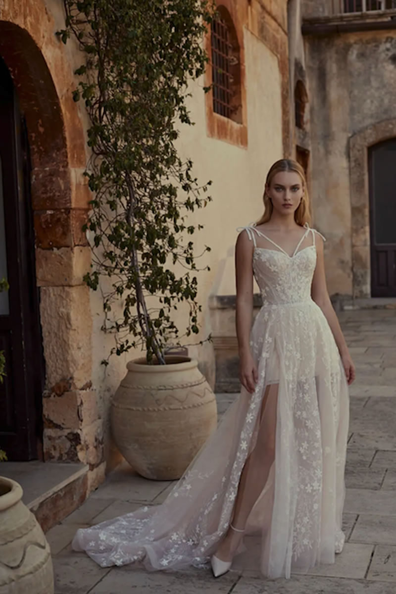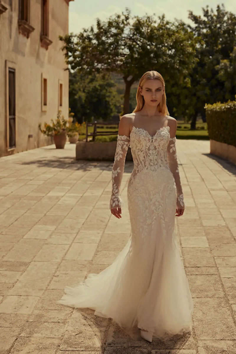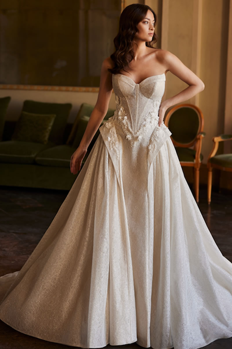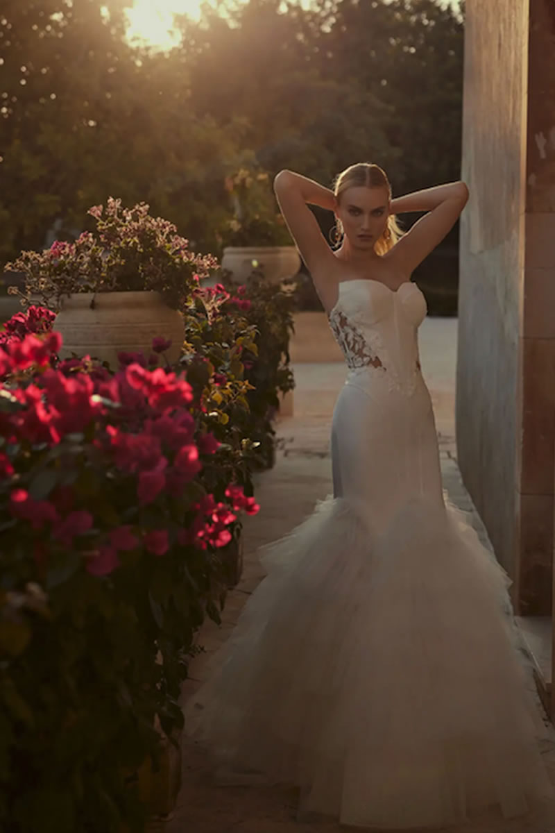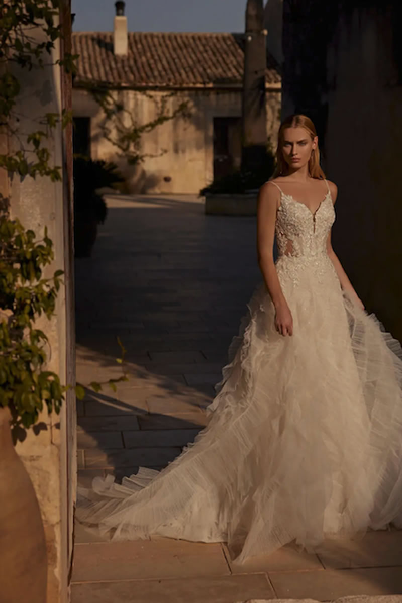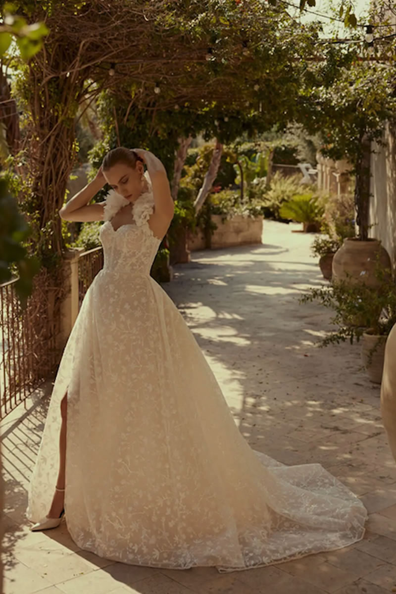 En el corazón de esta colección se encuentra una cautivadora muestra de tendencias que redefinen la elegancia nupcial. Elementos florales en 3D adornan con gracia diferentes siluetas, y la incorporación de tejidos innovadores, como el delicado bordado de caviar, eleva estos vestidos a un nivel de lujo incomparable. Adoptando tratamientos novedosos, la colección introduce volantes de formas originales y encantadoras. Los escotes de pico añaden un toque de refinamiento a la apariencia general de la novia.