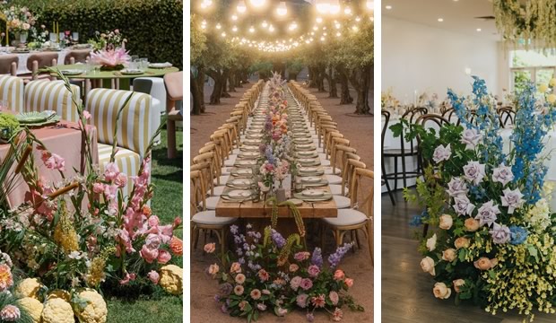Esa modalidad donde parece que las flores están «plantadas» y crecen directamente desde el suelo se conoce técnicamente como meadow arrangement, arreglo de pradera o flores de piso….